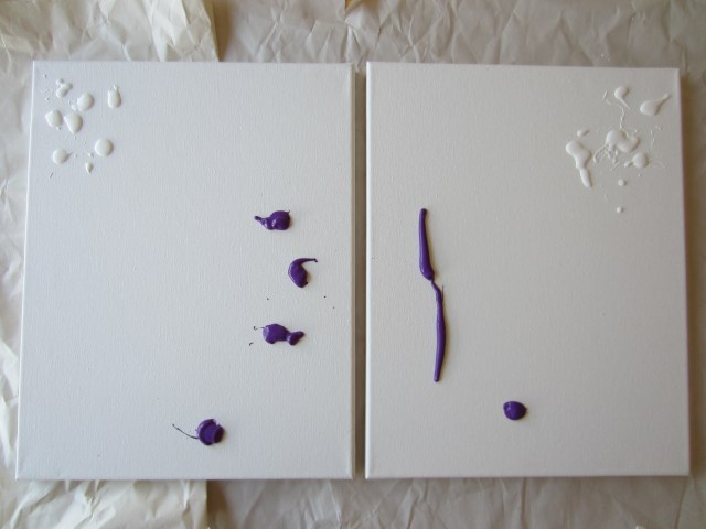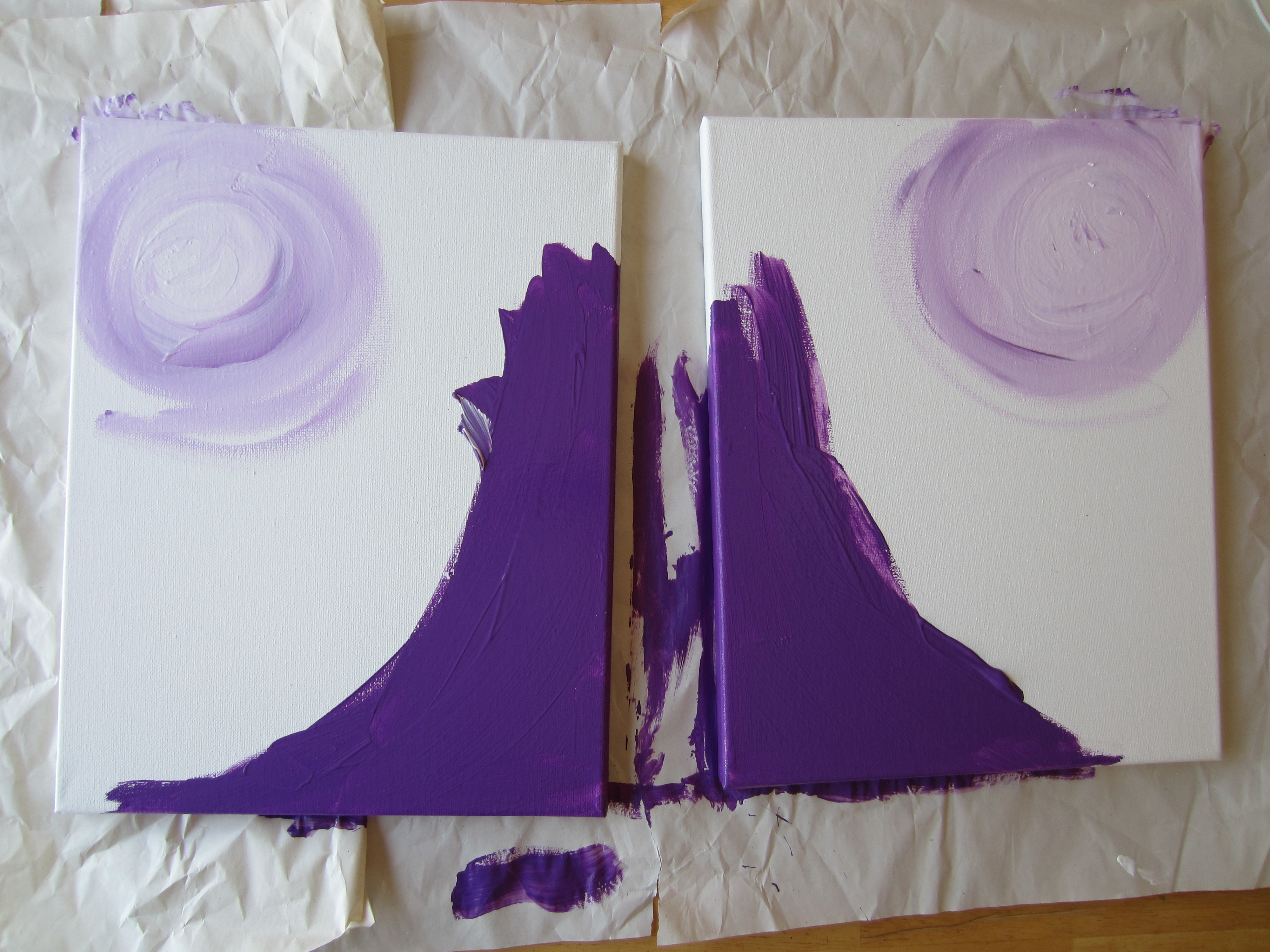 For this painting i used two 11×14″ canvi. I’m a big fan of rushing, and making as little mess as possible because I don’t clean so I can have more time to do the important things in life. So I’ve been starting my paintings by blobbing the acrylic paint right on the canvas like this. Feel free to use a plate or palate if your fancy. (I’d recommend using a plate if you don’t think you can complete the background quickly before the paint starts drying.) Pick a spot to be a focal light point and blob some white paint there. Put the darkest color you are using on the other side.