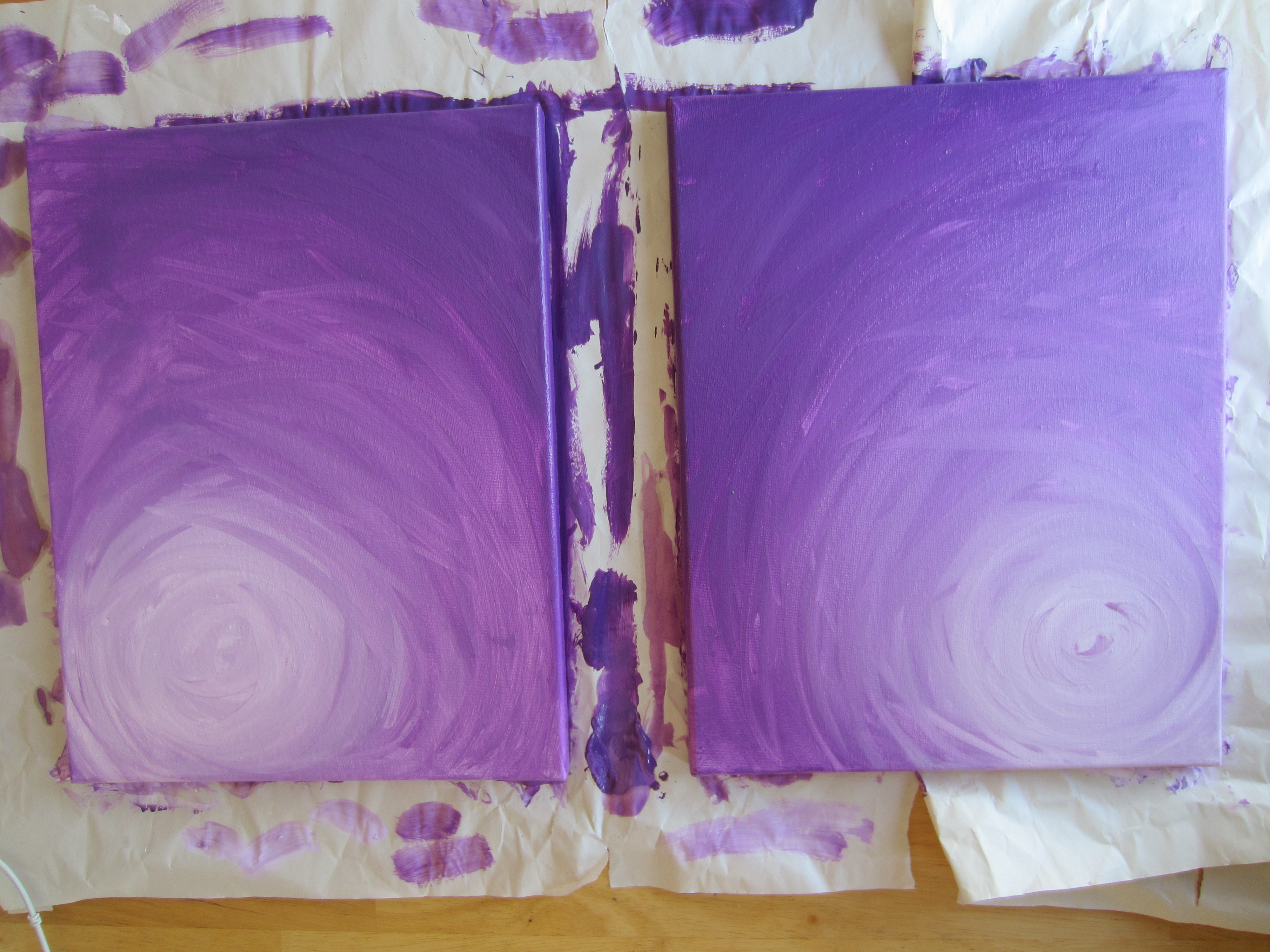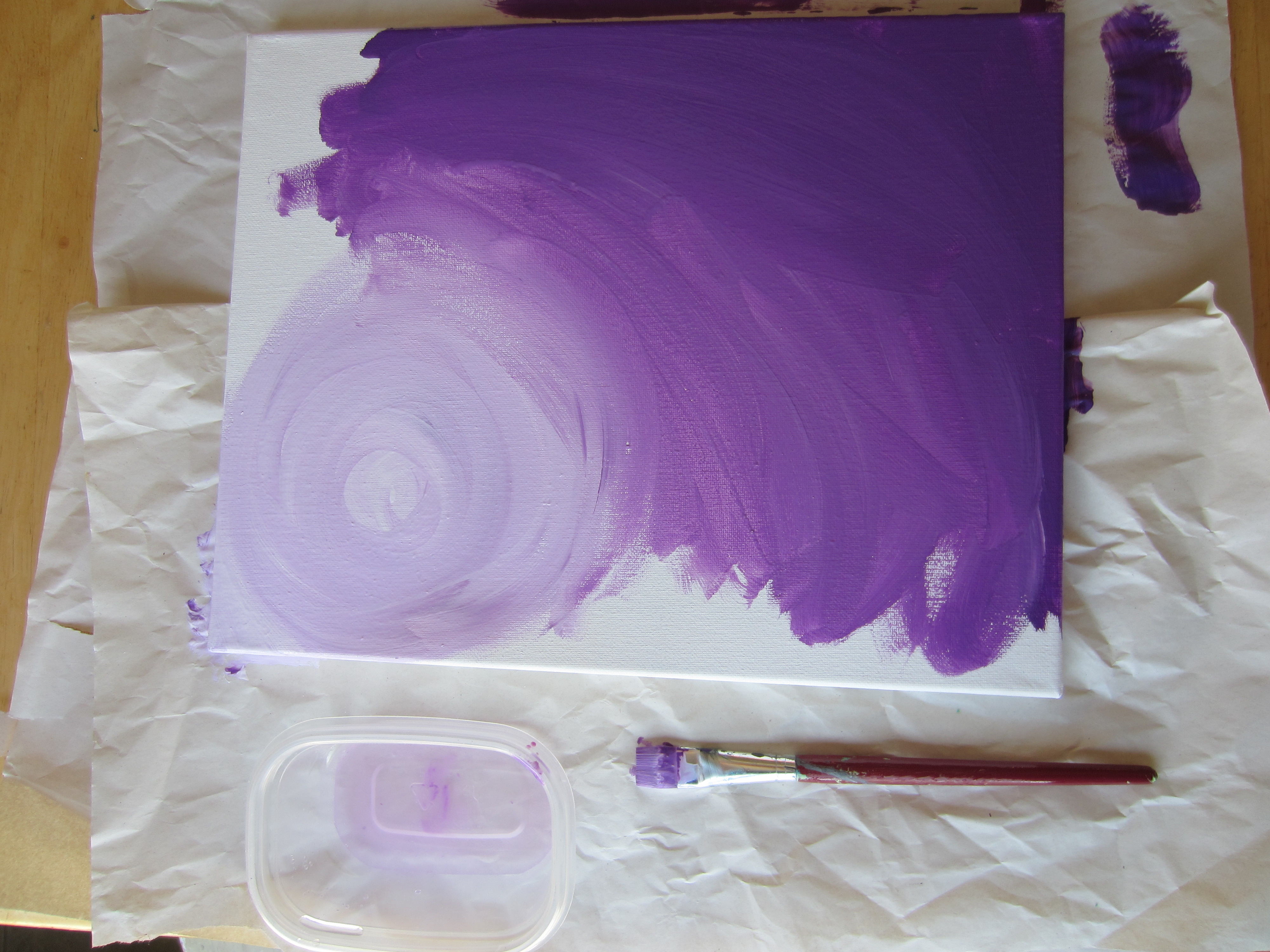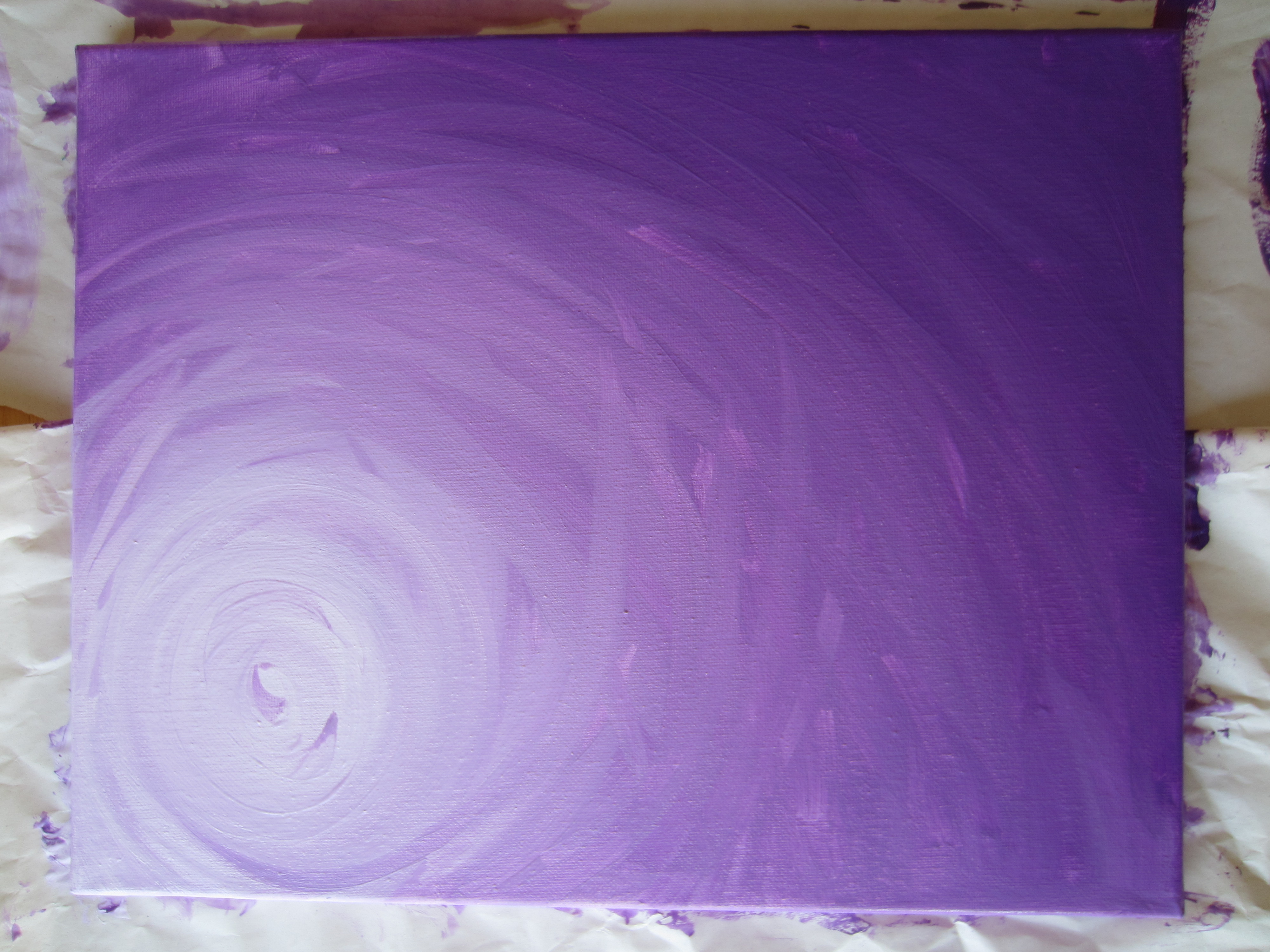 Once the canvas is covered in paint, just take your paintbrush and go around and around the light spot- going outward to the ends of the canvas. If you see a spot you don’t like, add more paint and blend from there. Try to keep the light spot light- you might need to add some extra white paint as you are going.