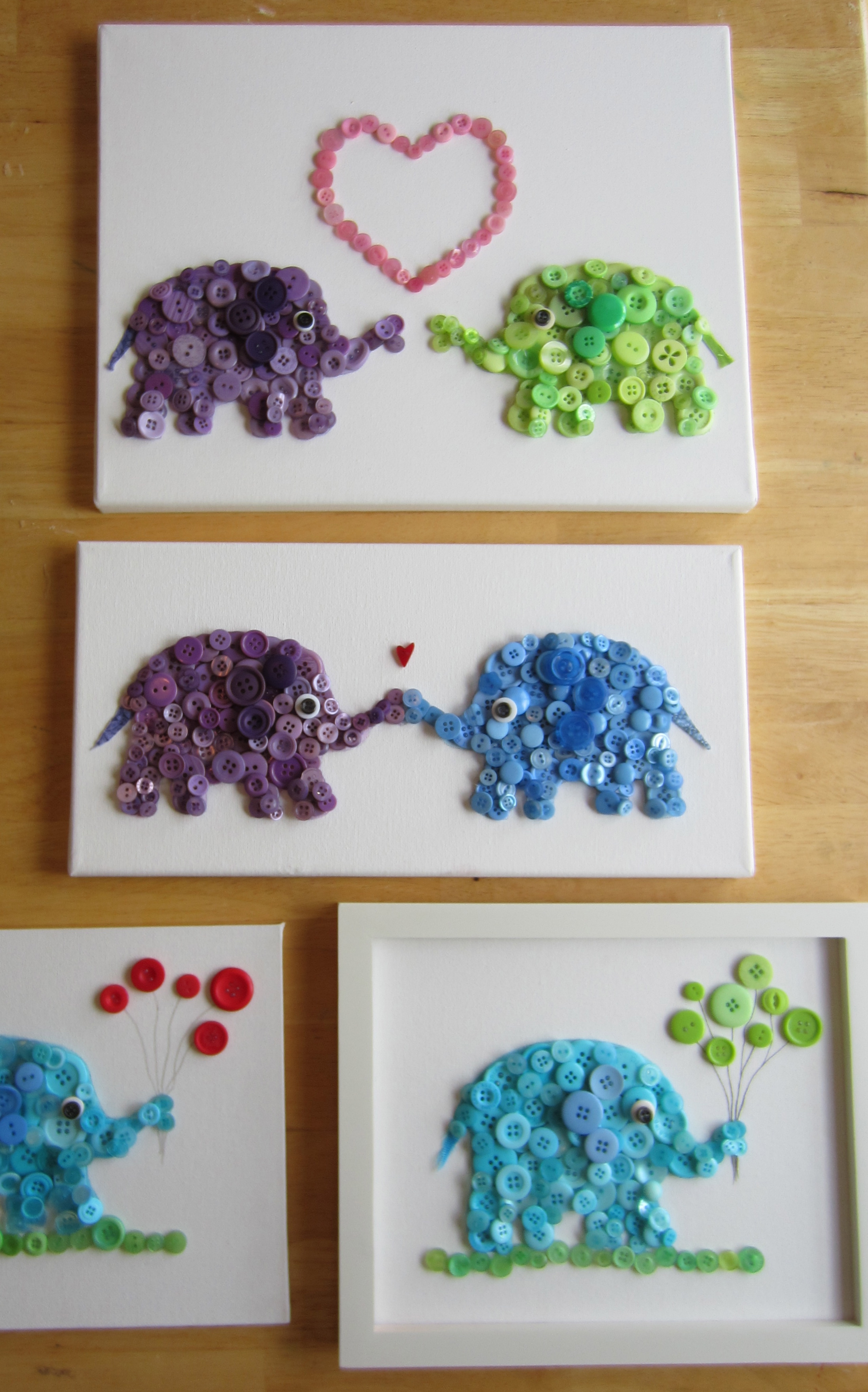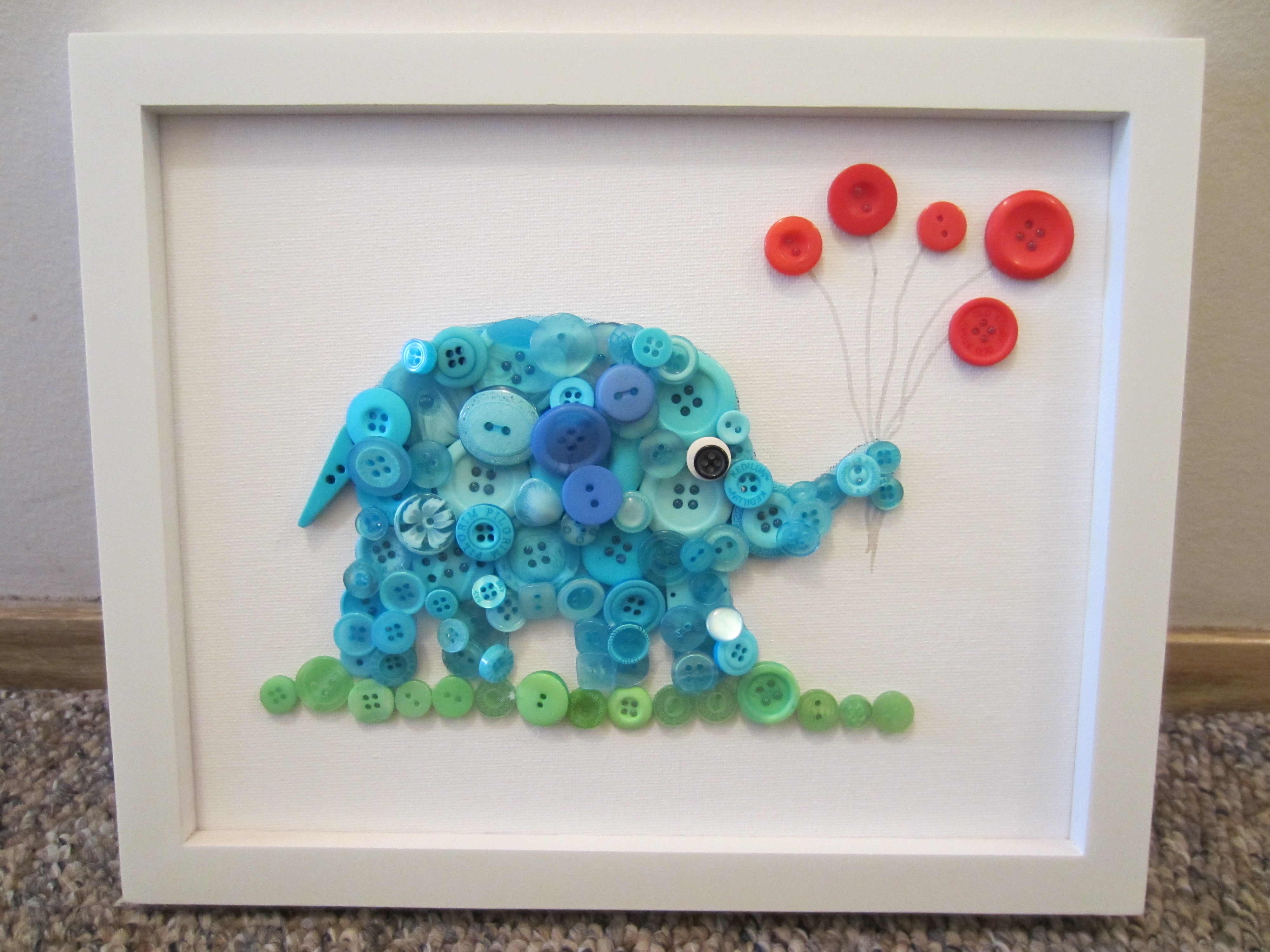 To make this cute little elephant, all you need are some buttons, hot glue, a wee bit of paint, a canvas board (which you can find at any craft store) and a frame.