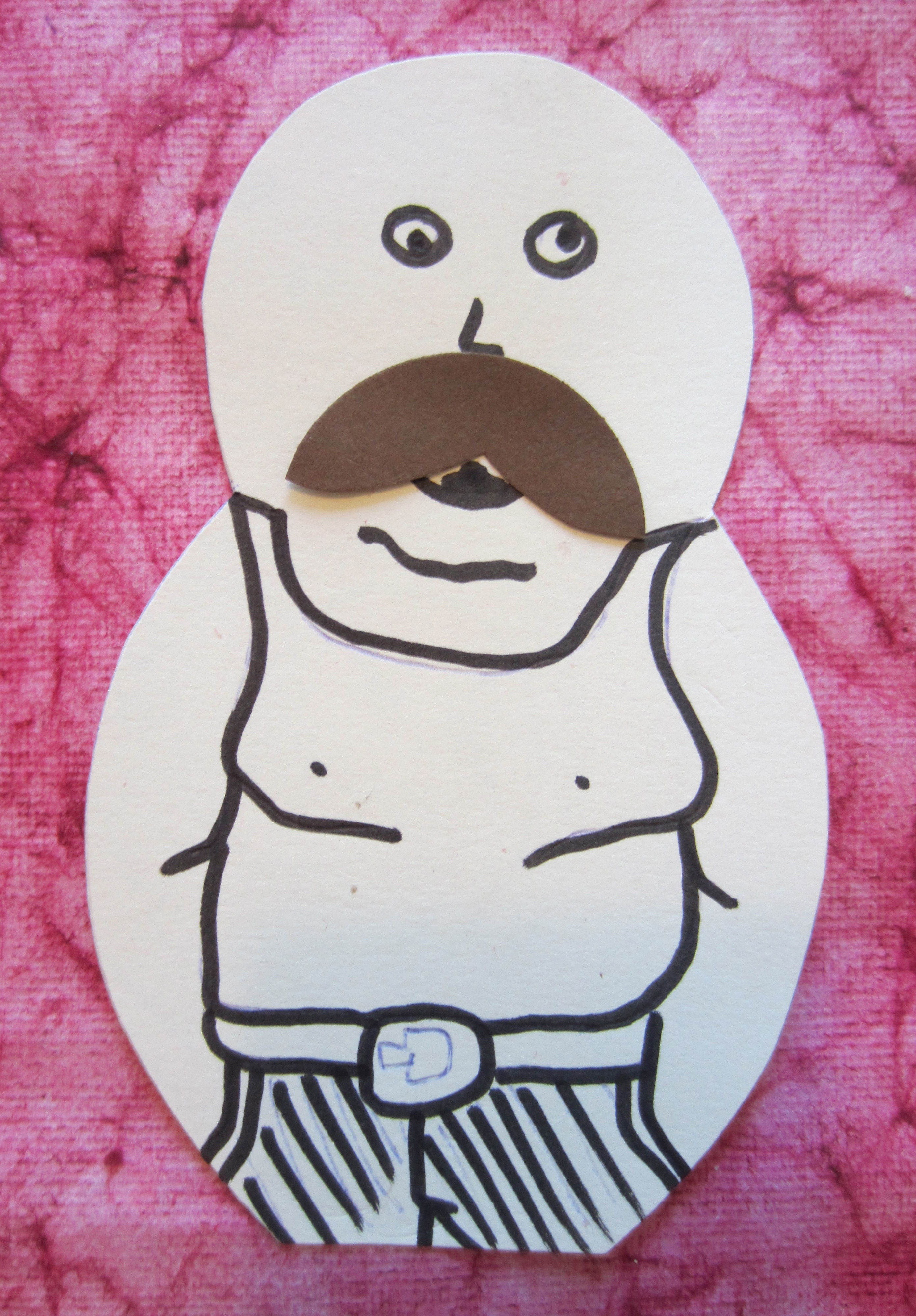 I cut out some little neck tie thingers, and then got to work on the aprons. To ensure the aprons would fit properly, I made this little pattern by tracing around one of the gals bodies:
