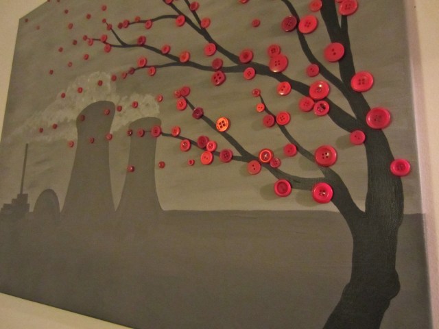 Morning sickness has gotten the better of me so I am officially a lame blogger for the past few and next few weeks! But I wanted to show off my fave painting as of late- I love the contrast of the beautiful bright button tree blowing in the wind along with the steam from the nuclear reactors. Creepy. ‘Ashes into beauty’ is a kick I’m on right now… I’ll go into more detail about that soon 😉