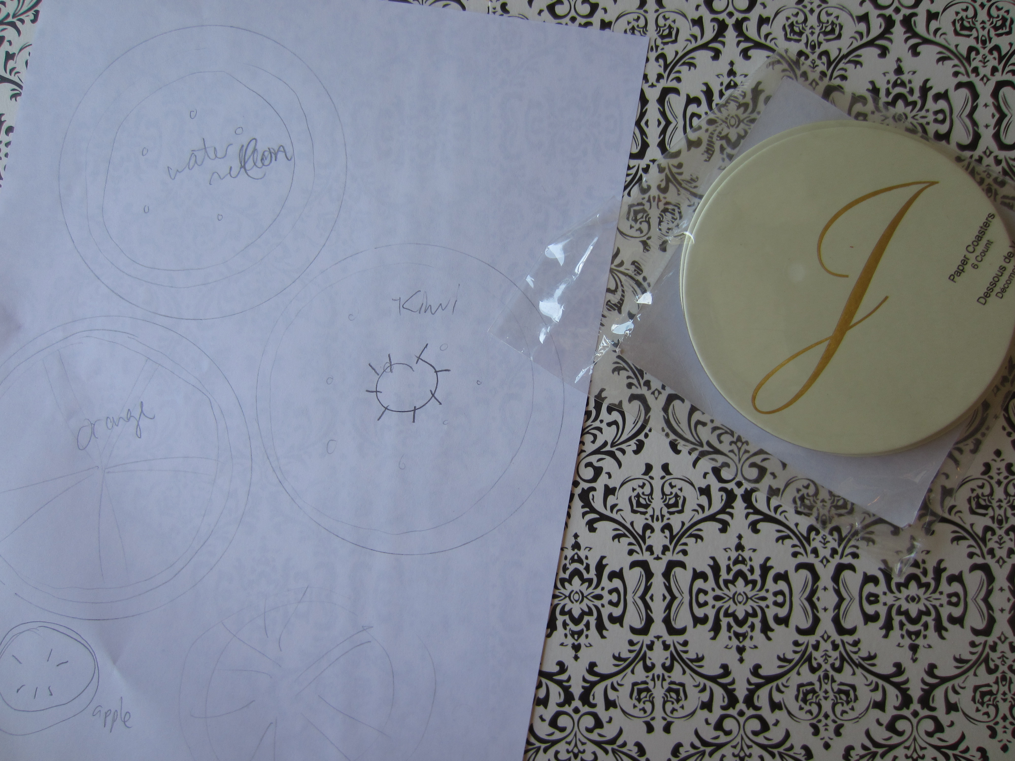 First I drew out a sketch of some fruit that I thought would work with the buttons. For the base of the coasters I used some tacky monogramed coasters I got for 10 cents at the craft store. I’m guessing the unreadability of the letter was part of the reason they were marked down so much. I think that’s supposed to be a ‘J’?!? Anyways, I snatched em up to save for a time like this!