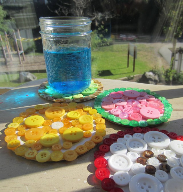 Next I quickly colored in the coasters with whatever I had kicking around- pens, crayons, and pencil crayons. This was an important step, because I wasn’t planning on overlapping the buttons (I knew I’d fall victim to a wobbly glass accident!), so I wanted the background that would show through to match.