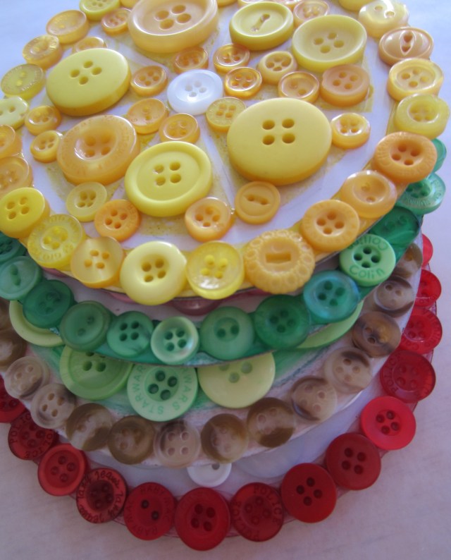 Gah-So cute!!! So the contest is to make a set of four fruit-inspired coasters! I was instantly inspired by my medium of choice- BUTTONS!