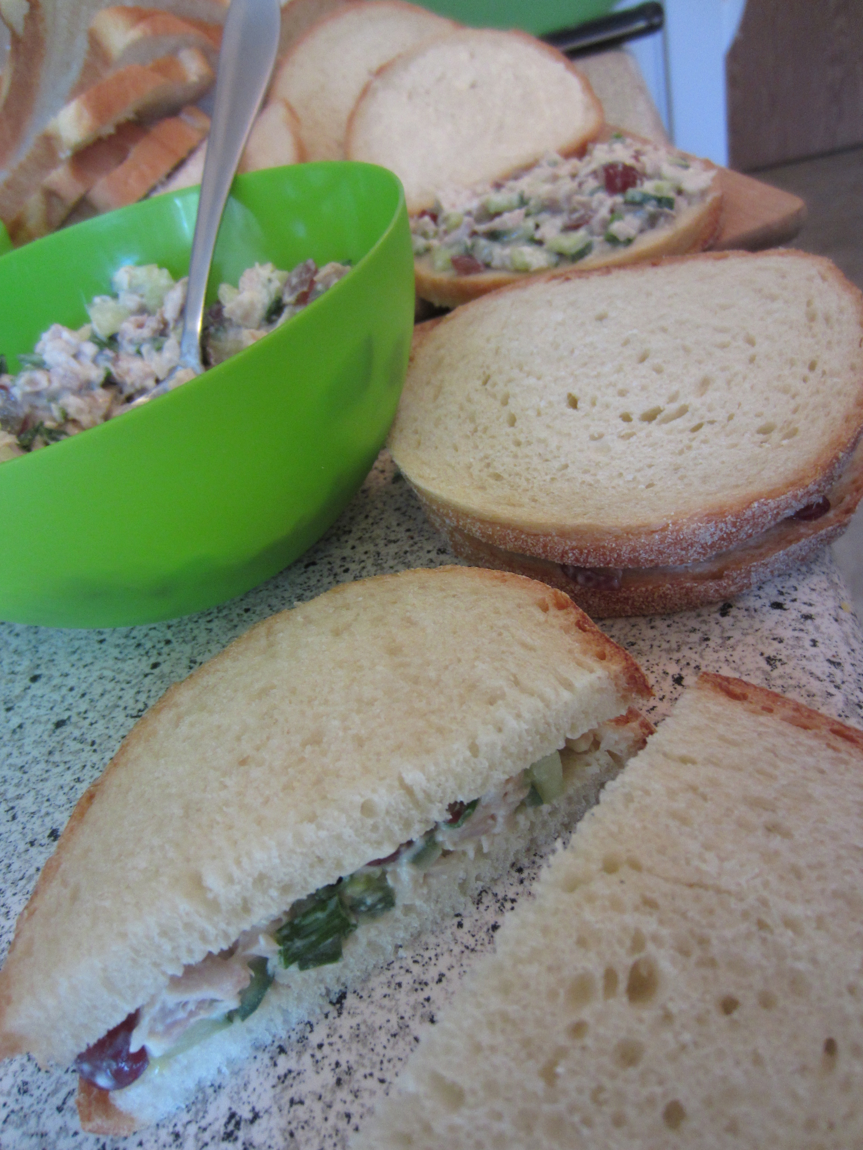 For the chicken salad sandwiches I used really thinly sliced sourdough bread. It was a cute lil round loaf, and it suited my tea party perfectly!
