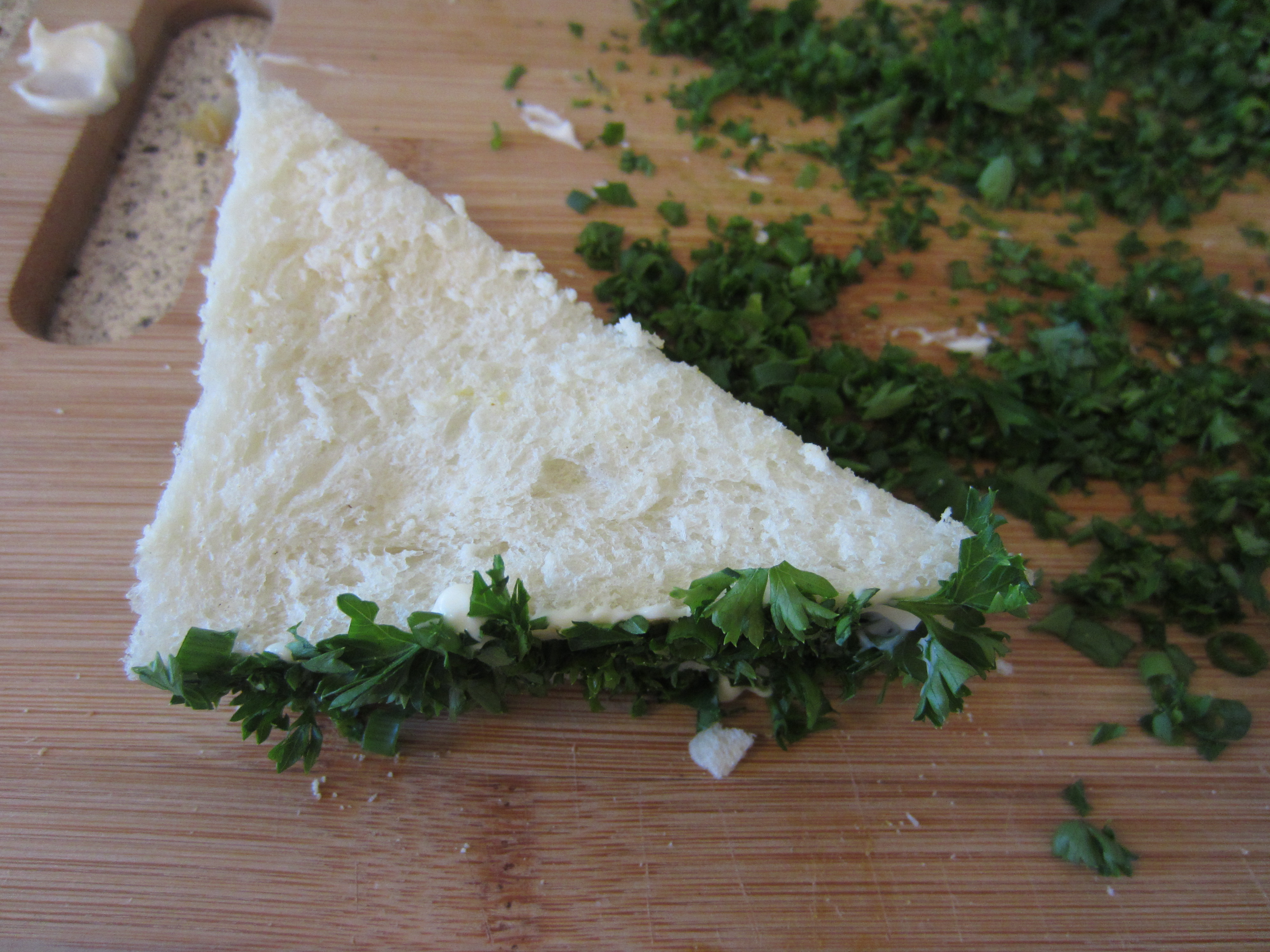 This garnish was my favorite part- swipe one side of the sandwich with a teensy bit of mayo, and dip it in your chopped parsley and chives.