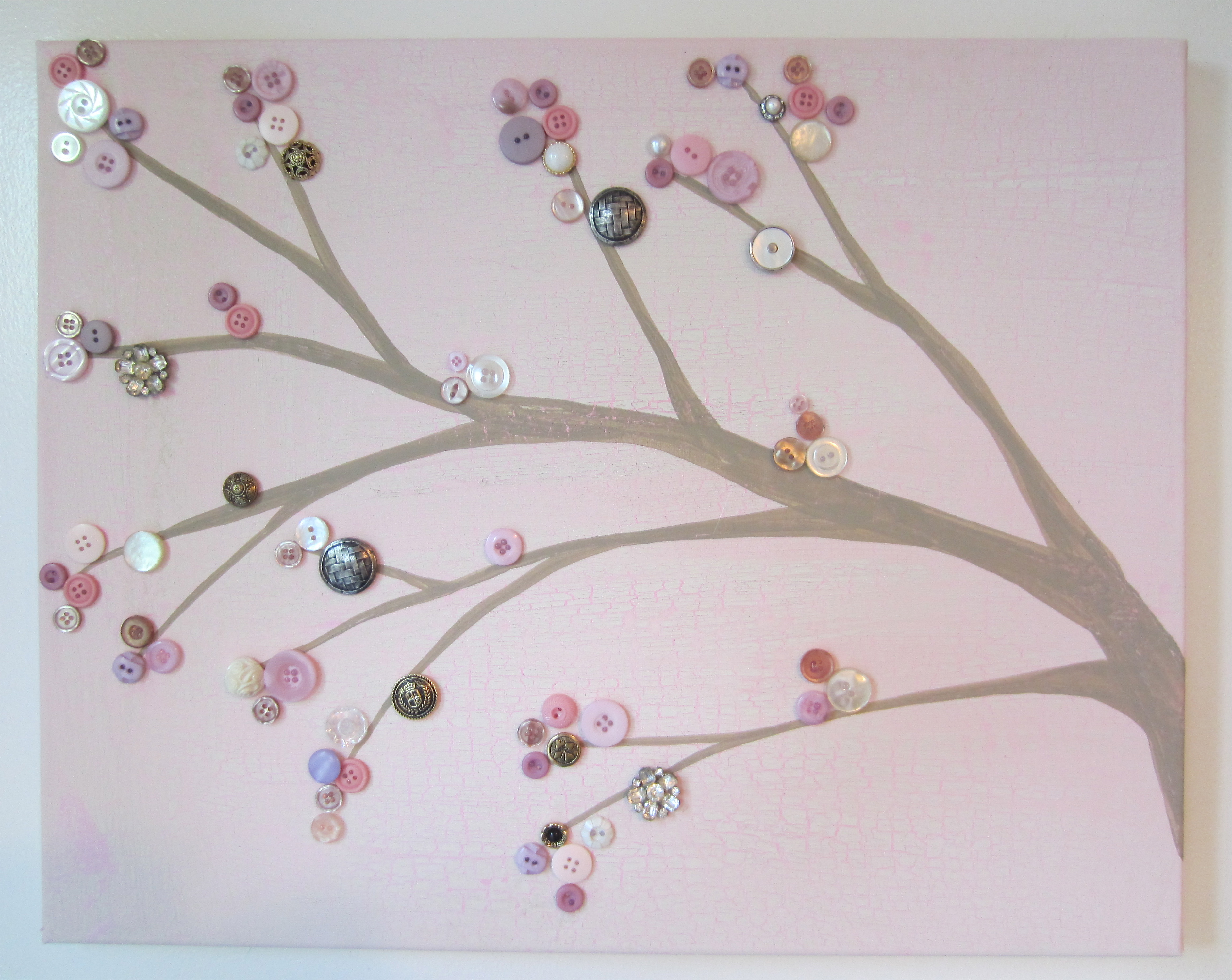 After a few bad morning-sick weeks, I have finally been back to painting! Here is something that I finished today! I’ve done a similar one before, and you can check out that post here. It includes all the details on how to create this nifty crackled effect with your paint- but for this post I thought I’d share a quick tutorial on how to deal with something that can be quite obnoxious for the avid buttoner. Yes, I am talking about nub buttons. You know- the ones with the nubs: