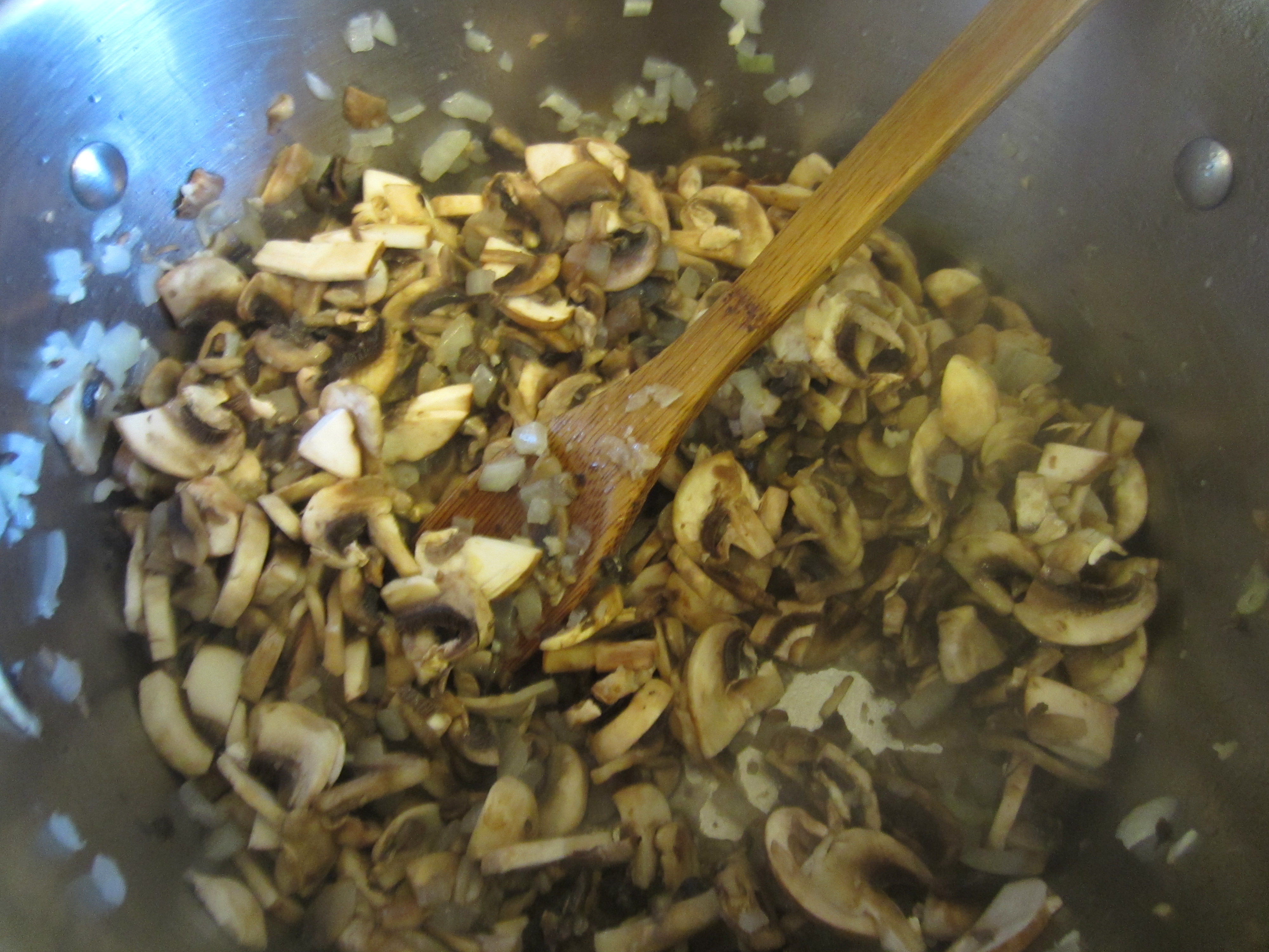 So the first thing you want to do is fry up your onion and garlic in some olive oil in a large pot for a few minutes, or until the onion becomes translucent. Next add your 3-4 cups of sliced mushrooms, dried herbs, and chili flakes. (You can use any combination of any kind of mushrooms here- I just used button and brown mushrooms because it’s what I had on hand.)