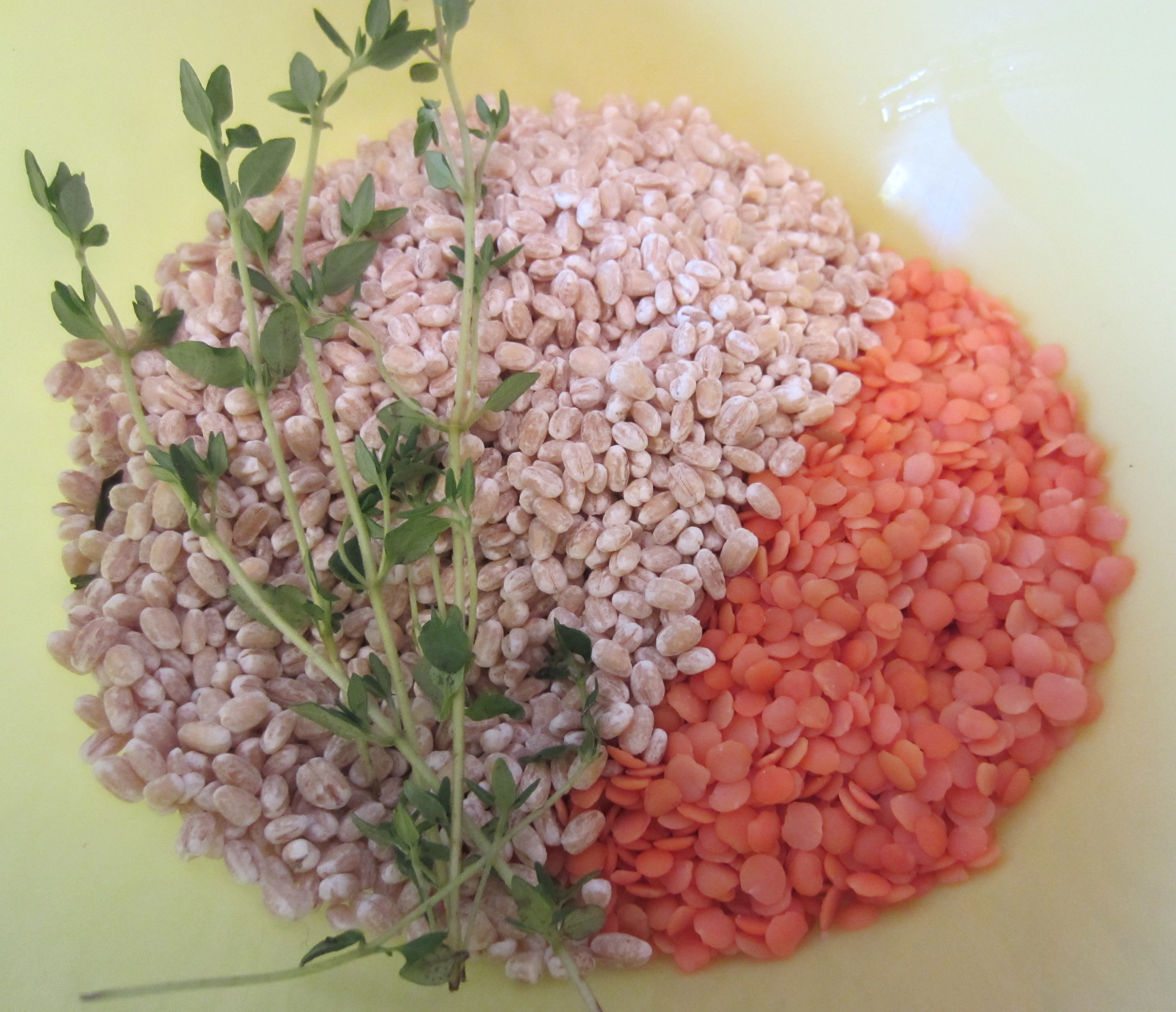 After the mushrooms get all coated and cooky for around 5-10 minutes, add your lentils, barley and fresh thyme. I suppose you could use 1/2 tsp dried thyme leaves, but this is one spot where fresh thyme really makes a good difference!