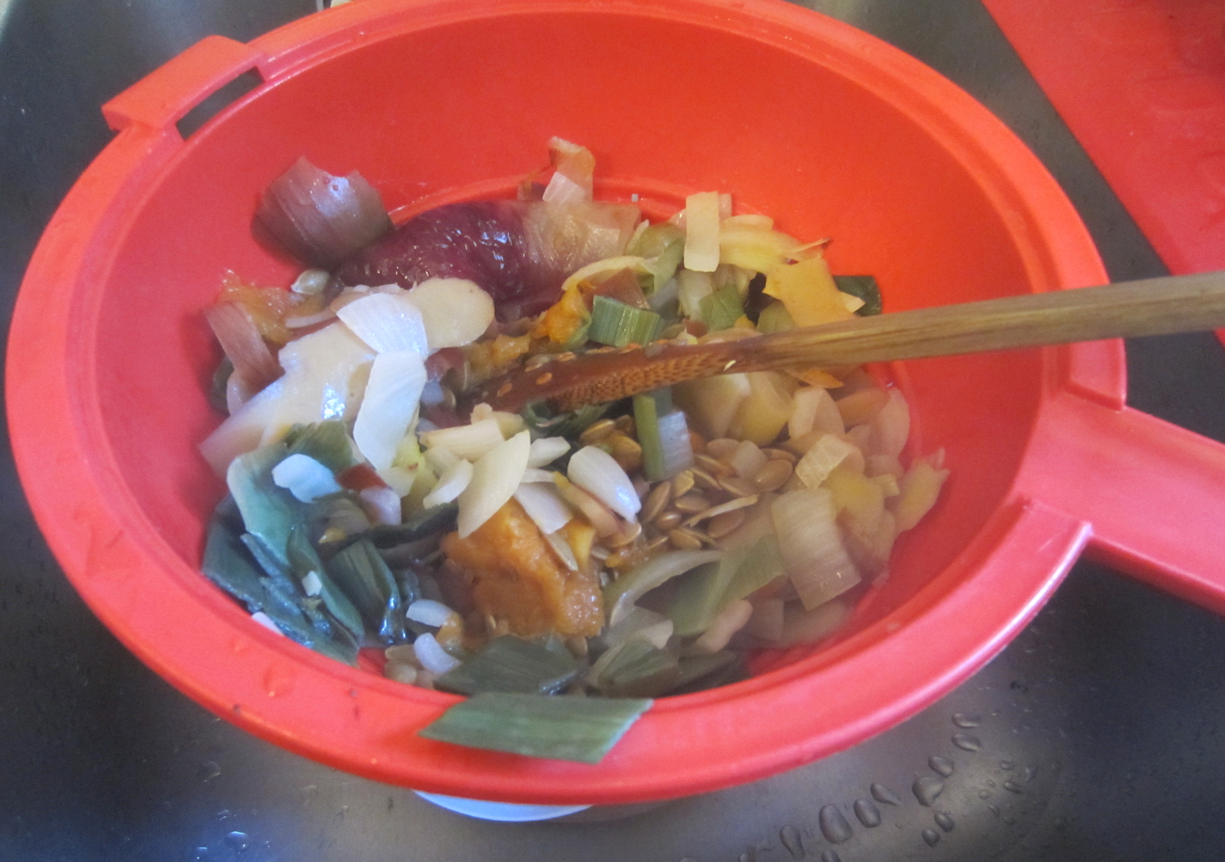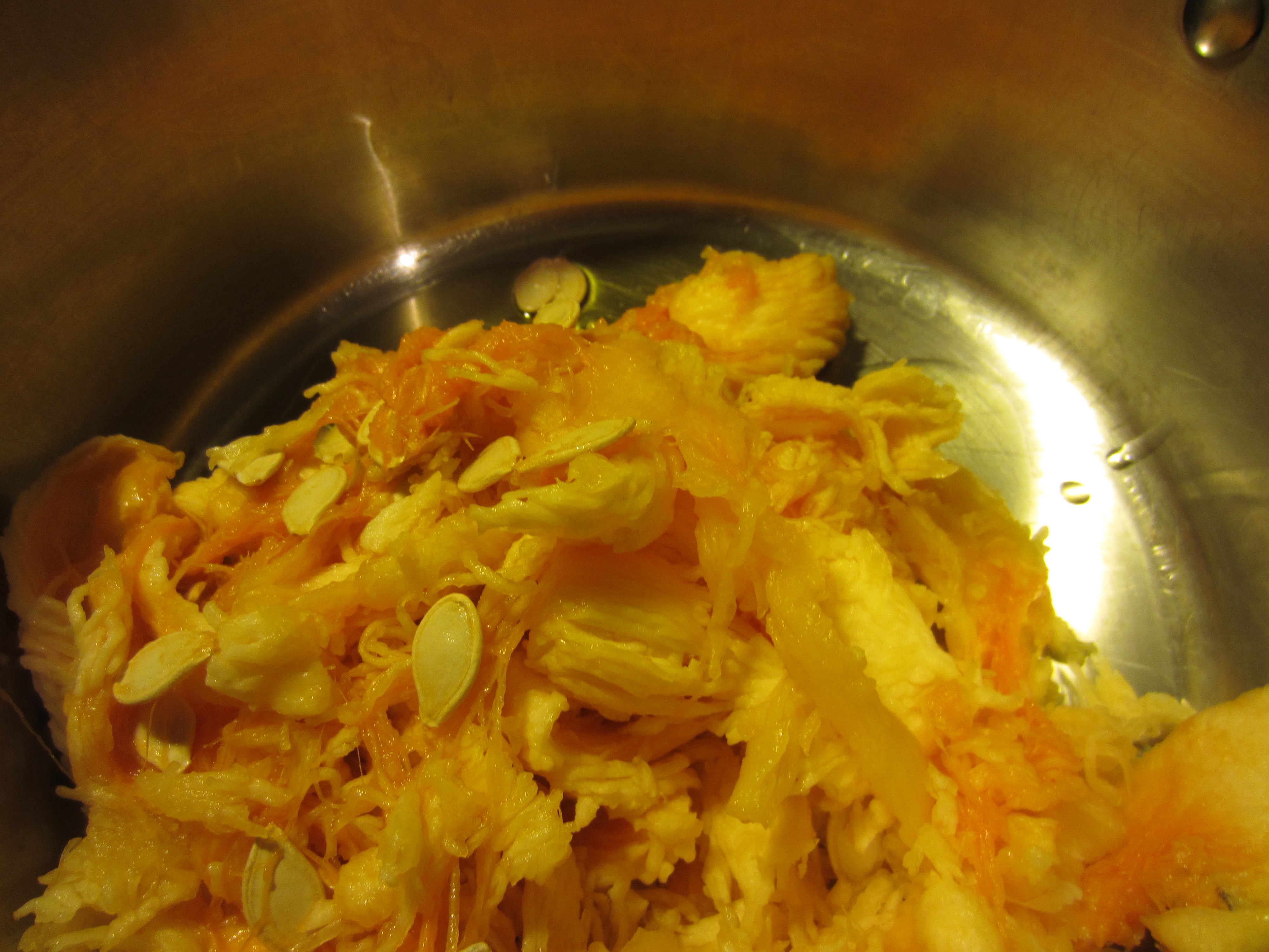 Take a nice pile of pumpkin guts (from a medium sized pumpkin) and remove most of the seeds (I’ll be sharing recipes for roasting the seeds asap).