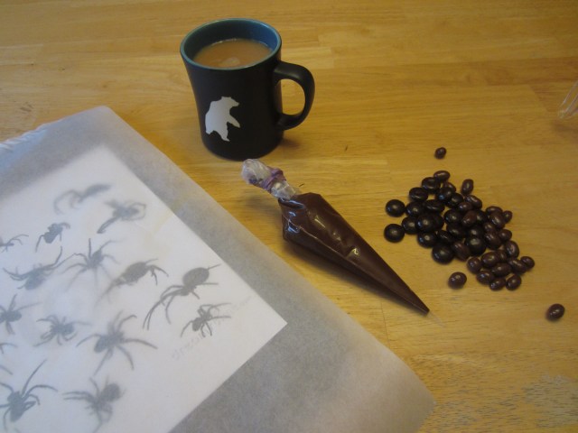 Step 4: Slowly pipe the chocolate over the images of the spiders. It took me a few spiders to really get the hang of it, and they do not have to be perfect-so be patient! Soon you’ll be on a roll!