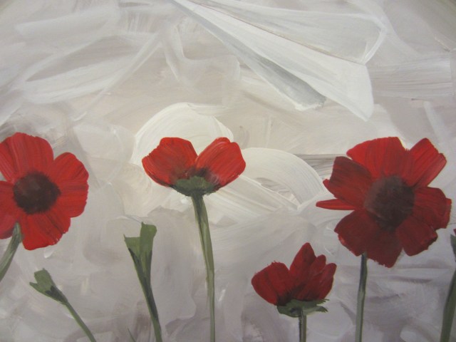 I’ve wanted to paint poppies for a while now, and I finally unpacked my painting supplies, (it was a long month without them!) so I figured it was the perfect time to try it! And it happens to be Remembrance Day in a few days too, so this is extra-good timing.  I painted this for my dad: (Can you see the hidden paper plane in the sky? I thought that would be an interesting touch!) I used a big, circle piece of mat board as my canvas and acrylics as my paint of choice. My dad’s dad died in World War II, so I think he will extra-appreciate this painting. Here is a write up about my grandfather and his aircrew that went down on Feb 20 1944: http://www.aircrewremembered.com/raf1944/2/bowenjack.html