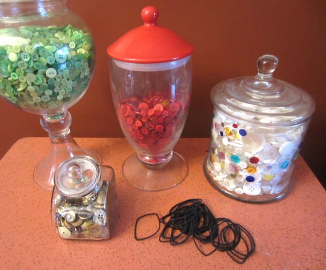 So, in the spirit of National Button Day (aka every day around here!) I got out some Christmassy buttons! (Pardon the hair ties- you will see what THOSE turned into on Monday morning.)
