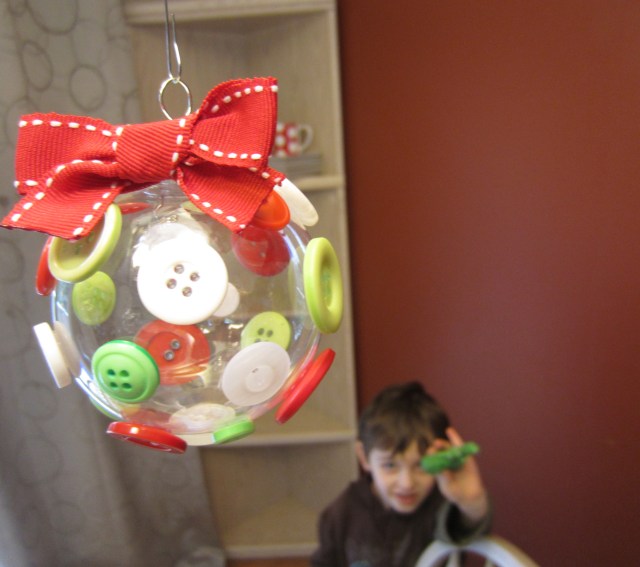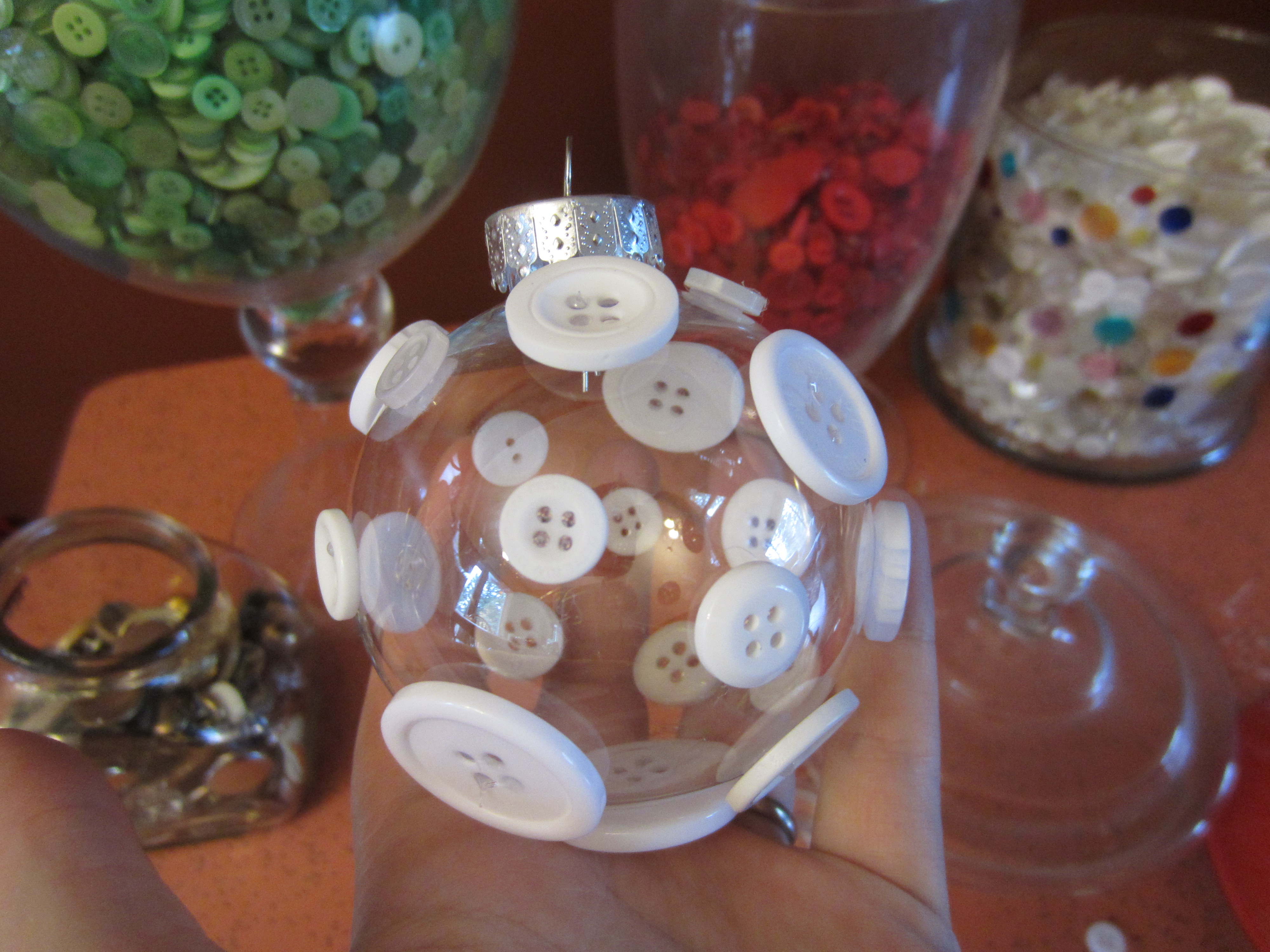 Step 2: Continue glueing different sized buttons all over your ornament. You can do a lot or a little, it’s up to you. I put these ones on fairly sparse because I am lazy I like the look.