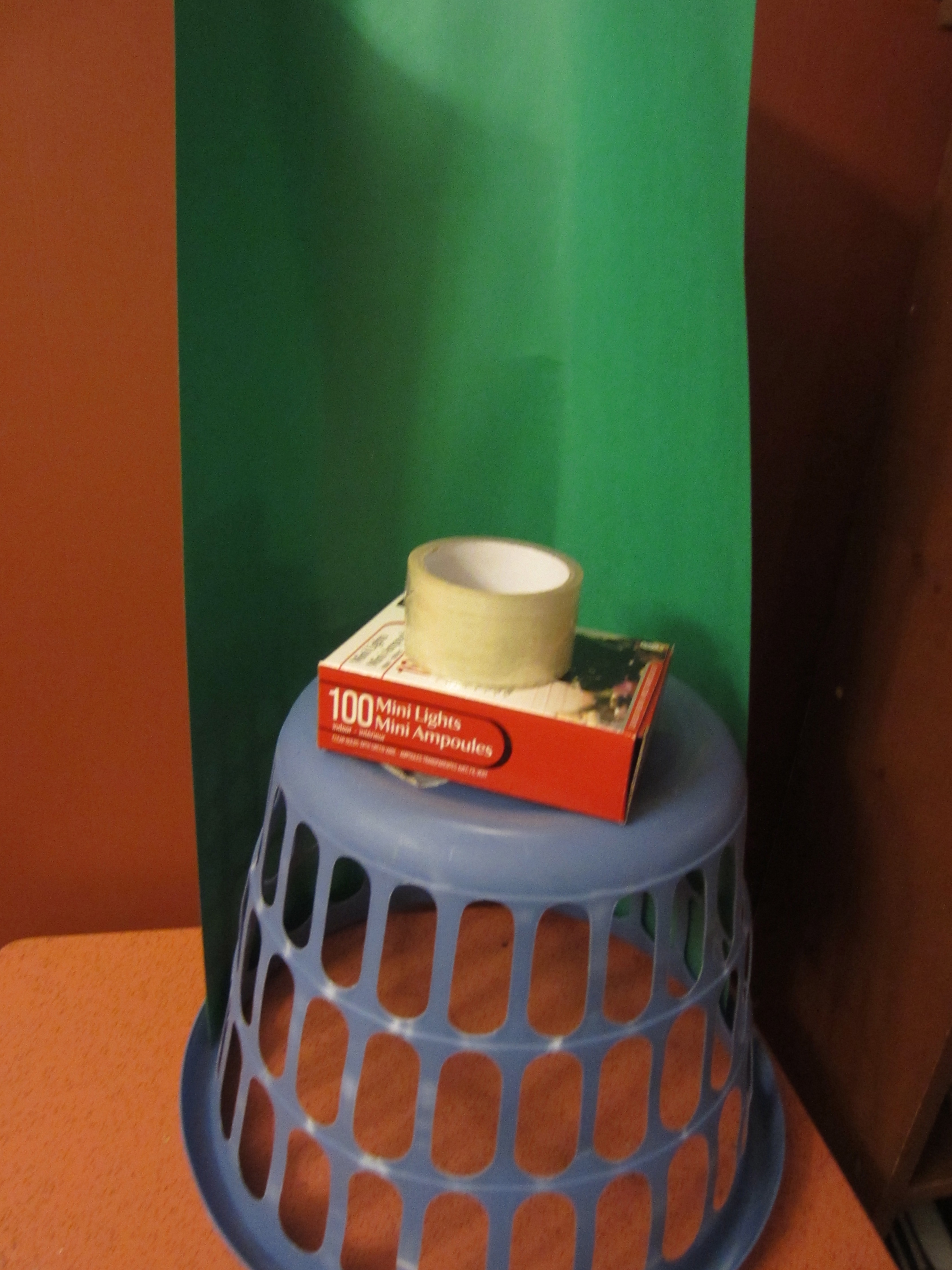 Step 3: Wrap these pieces around the bottom (top) of your laundry basket, and secure with more tape. Easy peasy… Now this needs some lights!