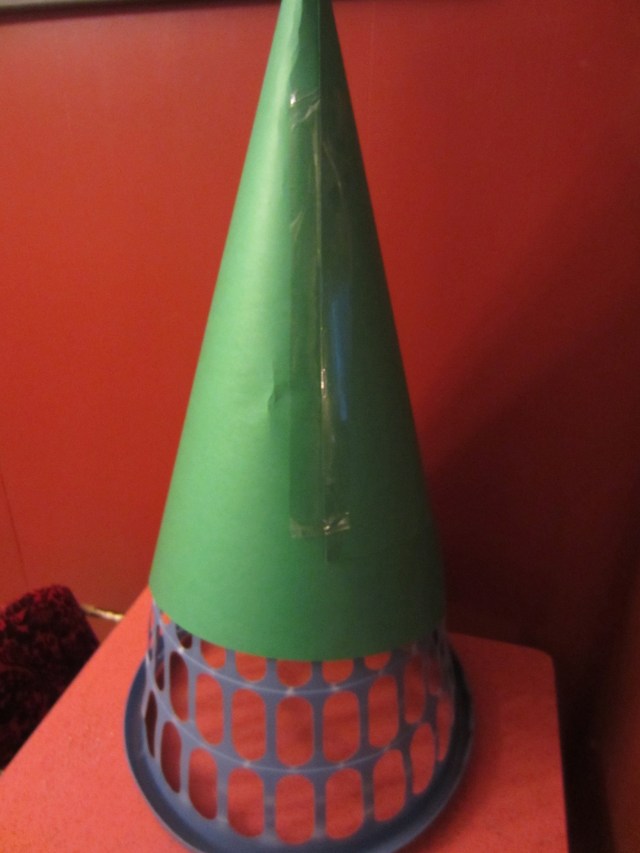 All I used to make my Christmas tree was a round laundry basket, two pieces of poster board, christmas lights, and tape!