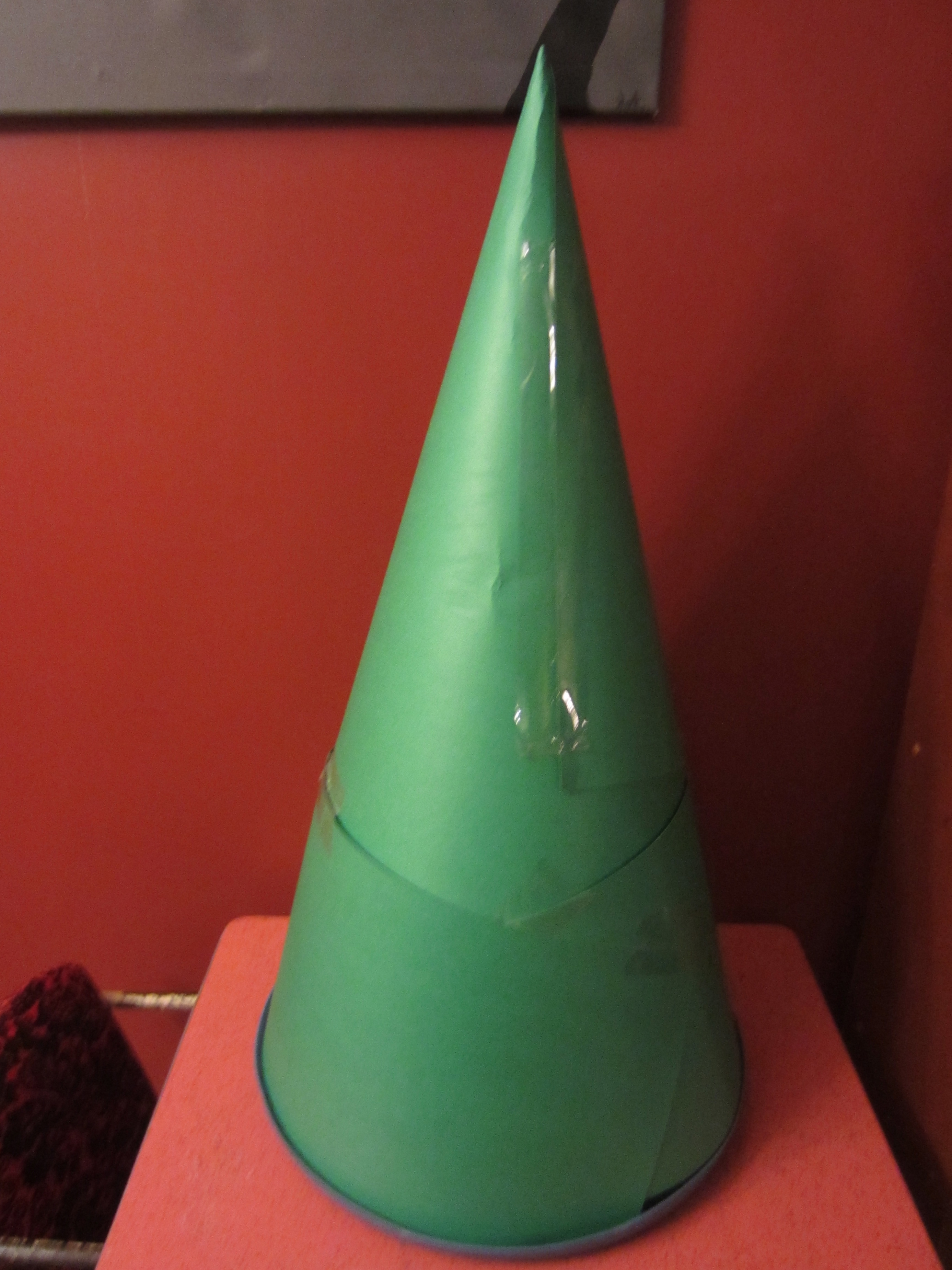 Step 1: Fold one piece of poster board into a cone and slip it over the base of your upside-down laundry basket. Secure it with some tape when you find the perfect fit. Remember, this doesn’t need to be perfectly beautiful- once the lights are on, it will look fabulous.
