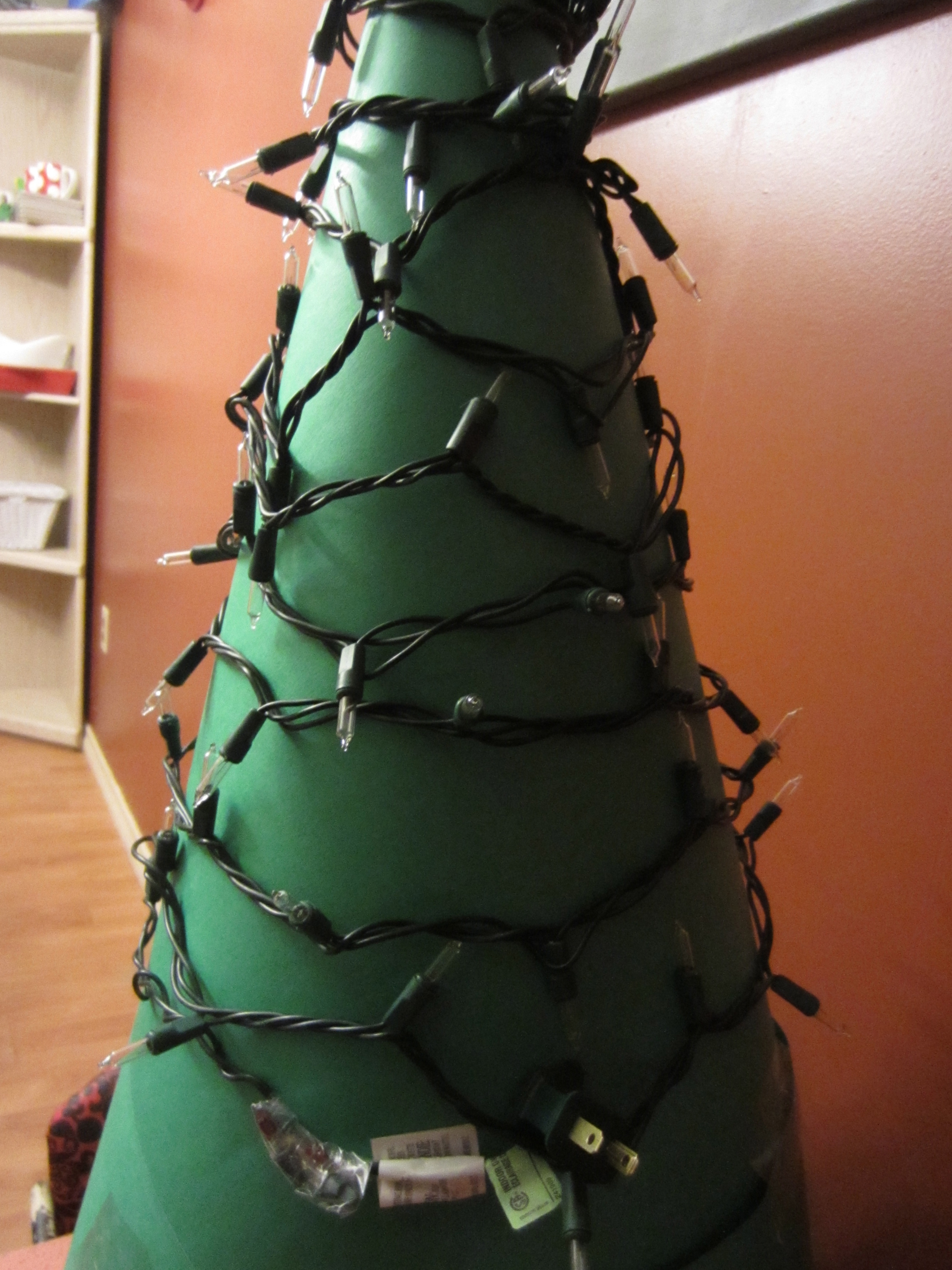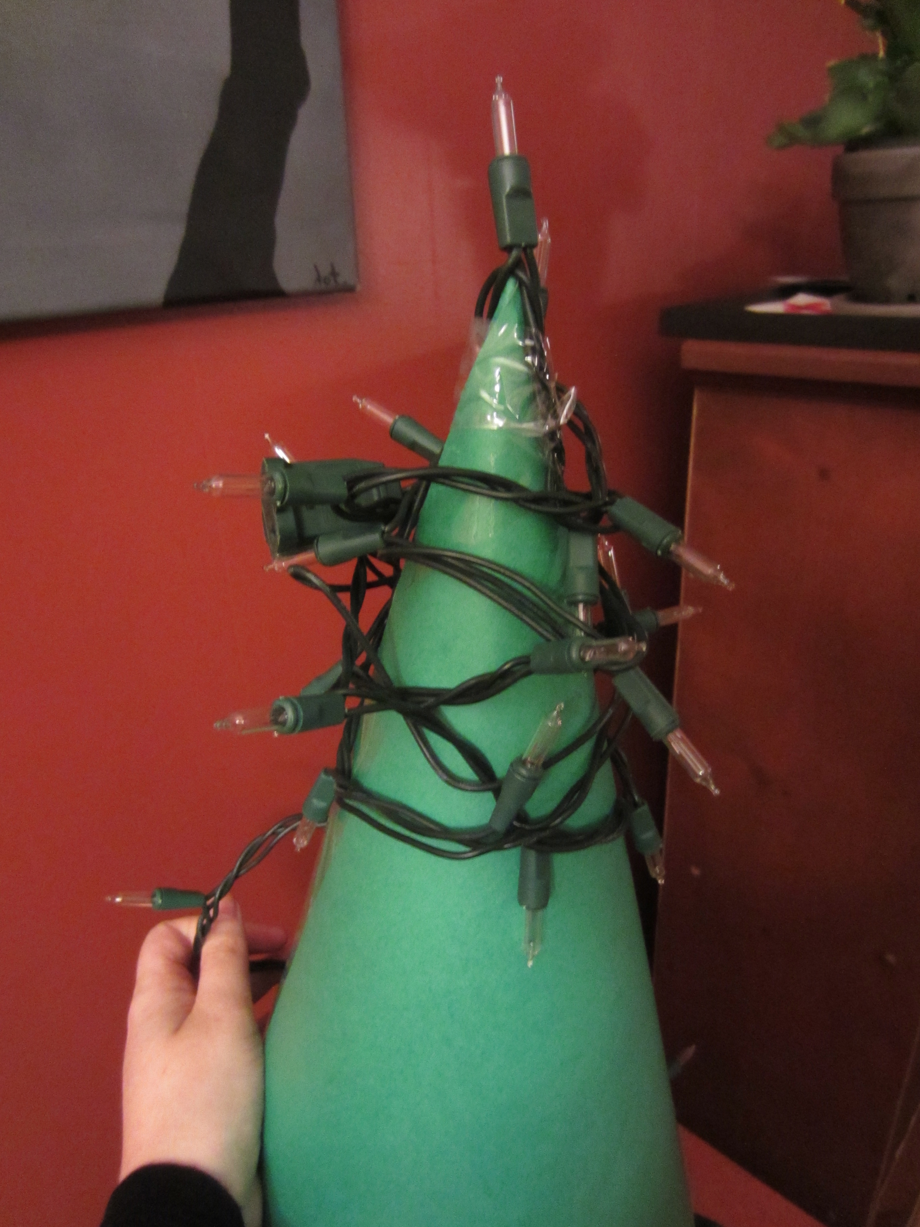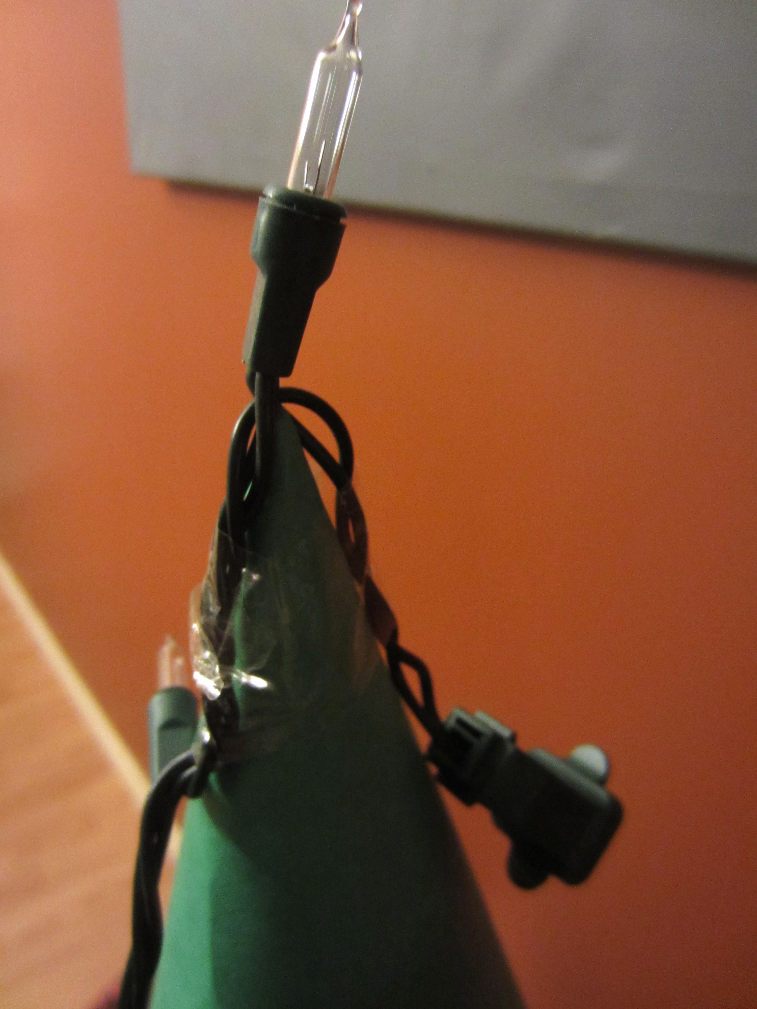As you go, add some more tape here and there to keep the lights in place. If you need to add another strand of lights, just keep the ugly bits in the back. I used two 100-light strands for this 3.5 foot tall tree.