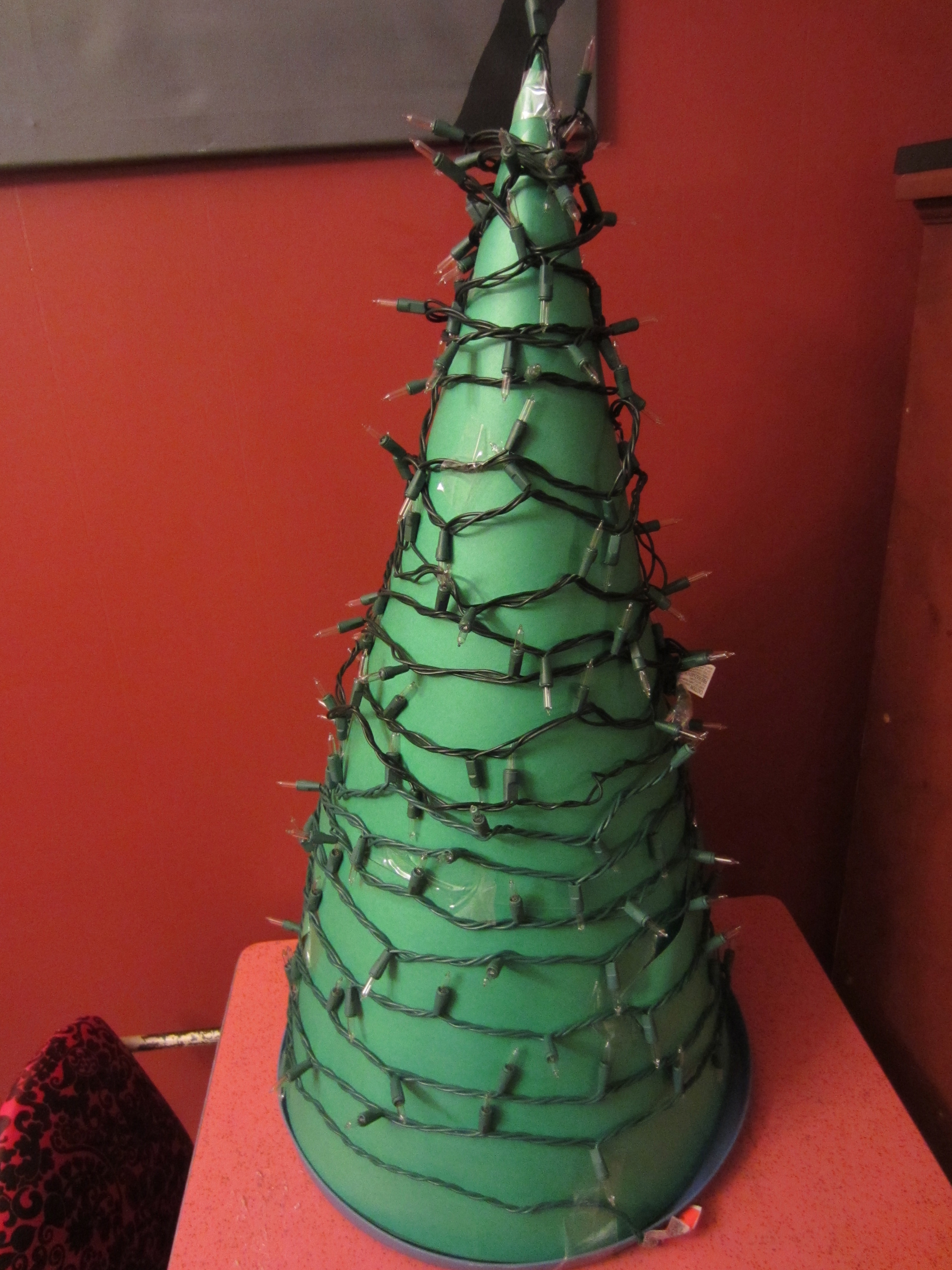 Ain’t it a pretty sight? I am going to share a simple tutorial on how to make your own Light-up Christmas tree decoration! I have been eyeing up these big light up tree decorations for a while but they are always so expensive! There are even a bunch of different tutorials on how to make your own, but they usually involve spending a bunch of money or using items I don’t have kicking around. Here is a video tutorial on how to make a really cool one using a tomato cage- such a good idea, but I didn’t have a tomato cage, so I improvised.