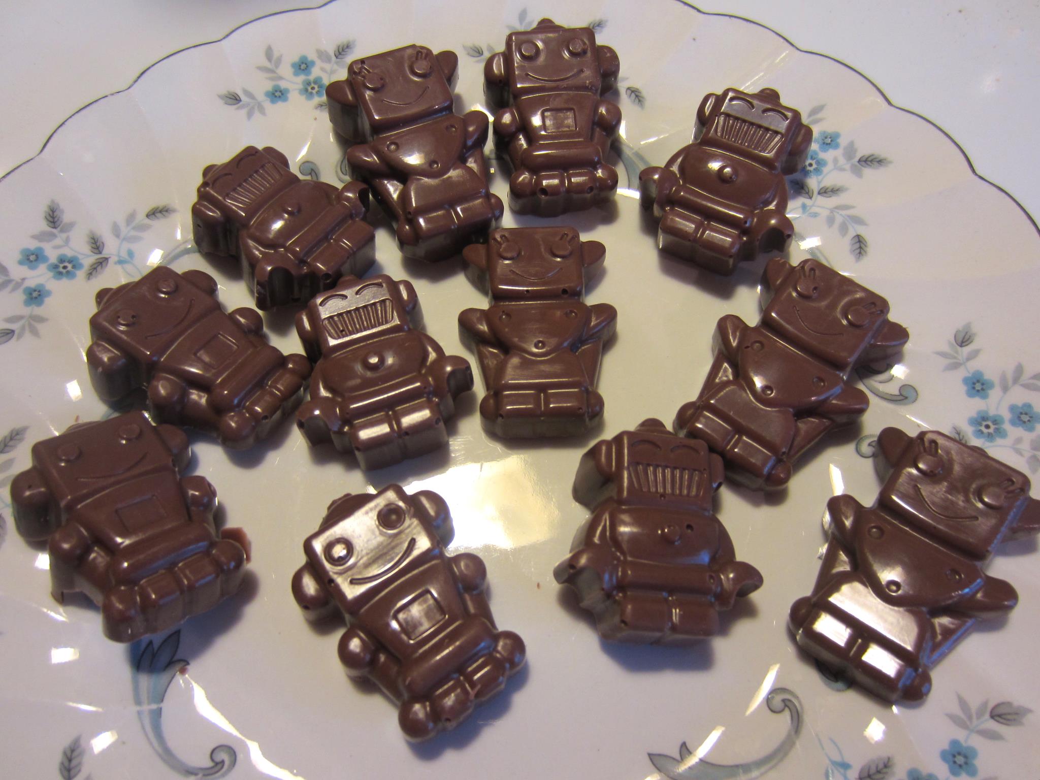 I love me some melting wafers, and if you saw my 12 Days of Christmas Snacktivities series, I’m sure you picked up on that! It is so easy to make nifty candies and cupcake toppers with them! All you need to do is get yourself a cool silicone mold, (I got this one off of Etsy– the American shop I got it from is sold out, but you can just search ‘robot mold’ and a bunch of options will come up!) melt some chocolate, then set it and forget it! Well, don’t forget it…