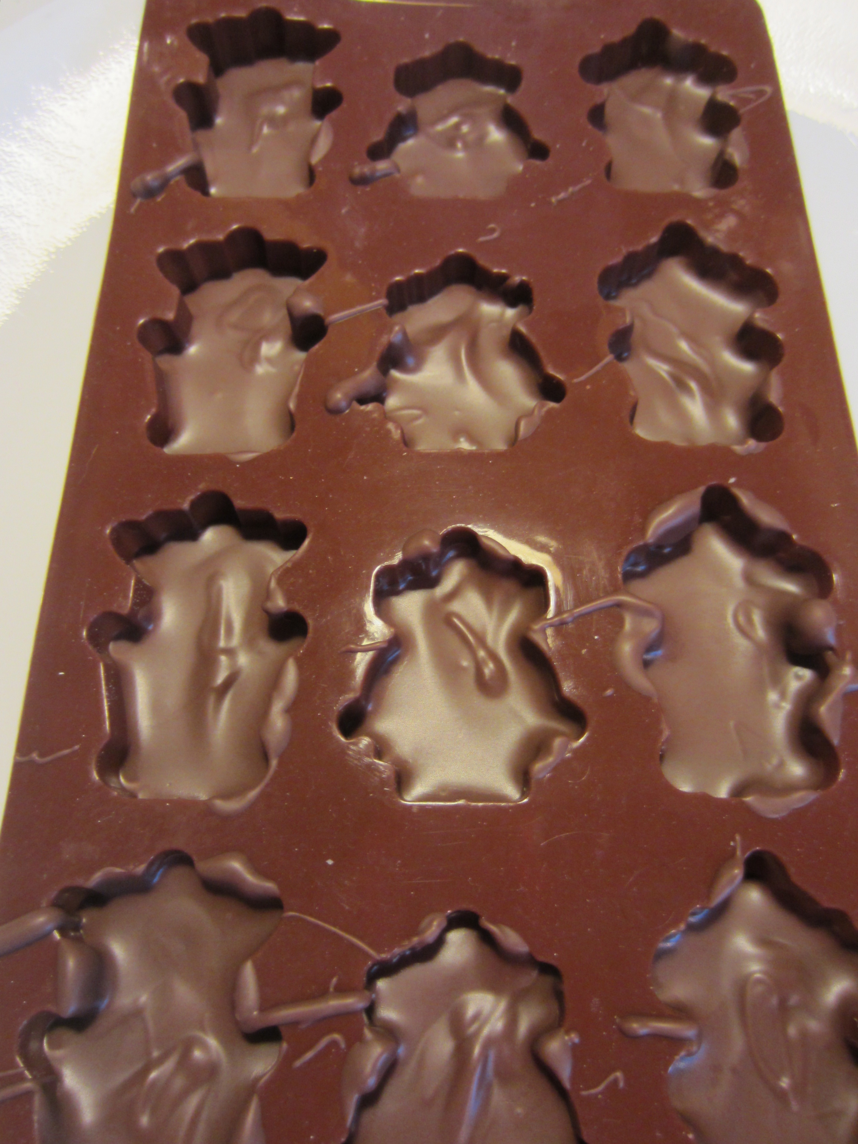 Spoon your melted chocolate into your mold. It doesn’t have to be purdy, you can trim off any random scraggler chocolate after it has set. Next let the chocolate harden. If you are in a rush or impatient, you can place it in the refrigerator for 5-10 minutes, but if you have time, just let them set at room temperature. Sometimes the chocolate gets an imperfect look to it after it’s been cold.