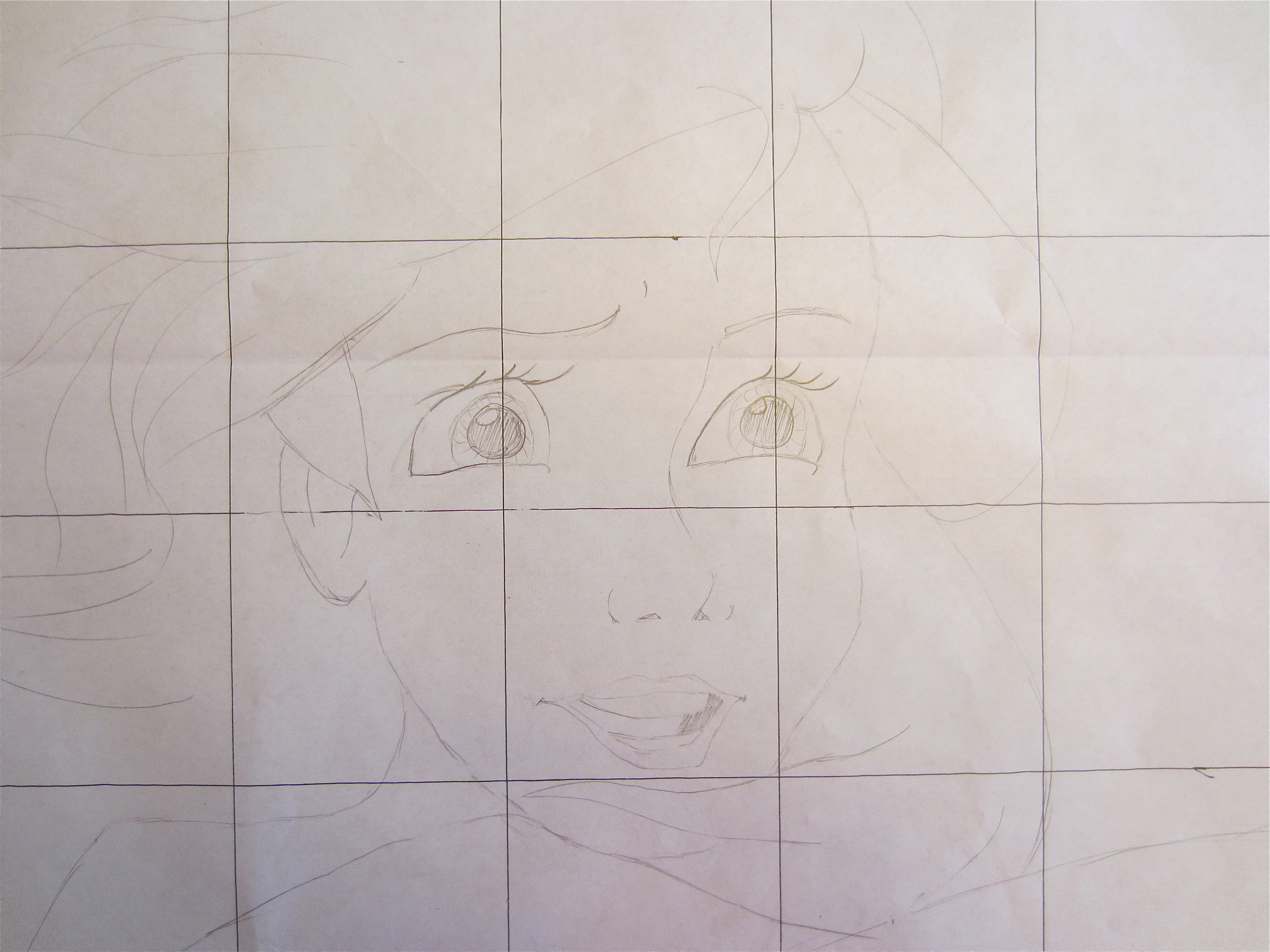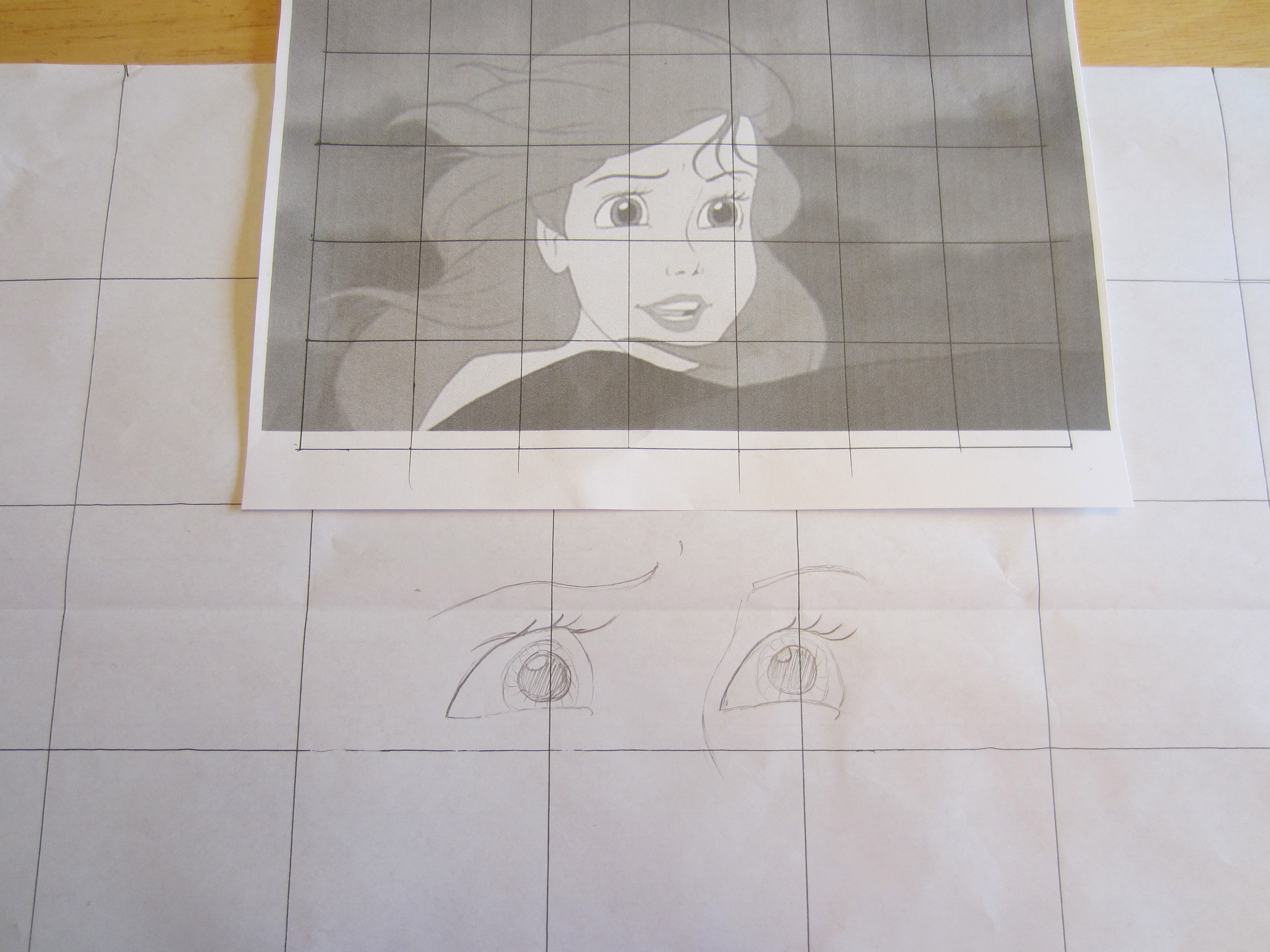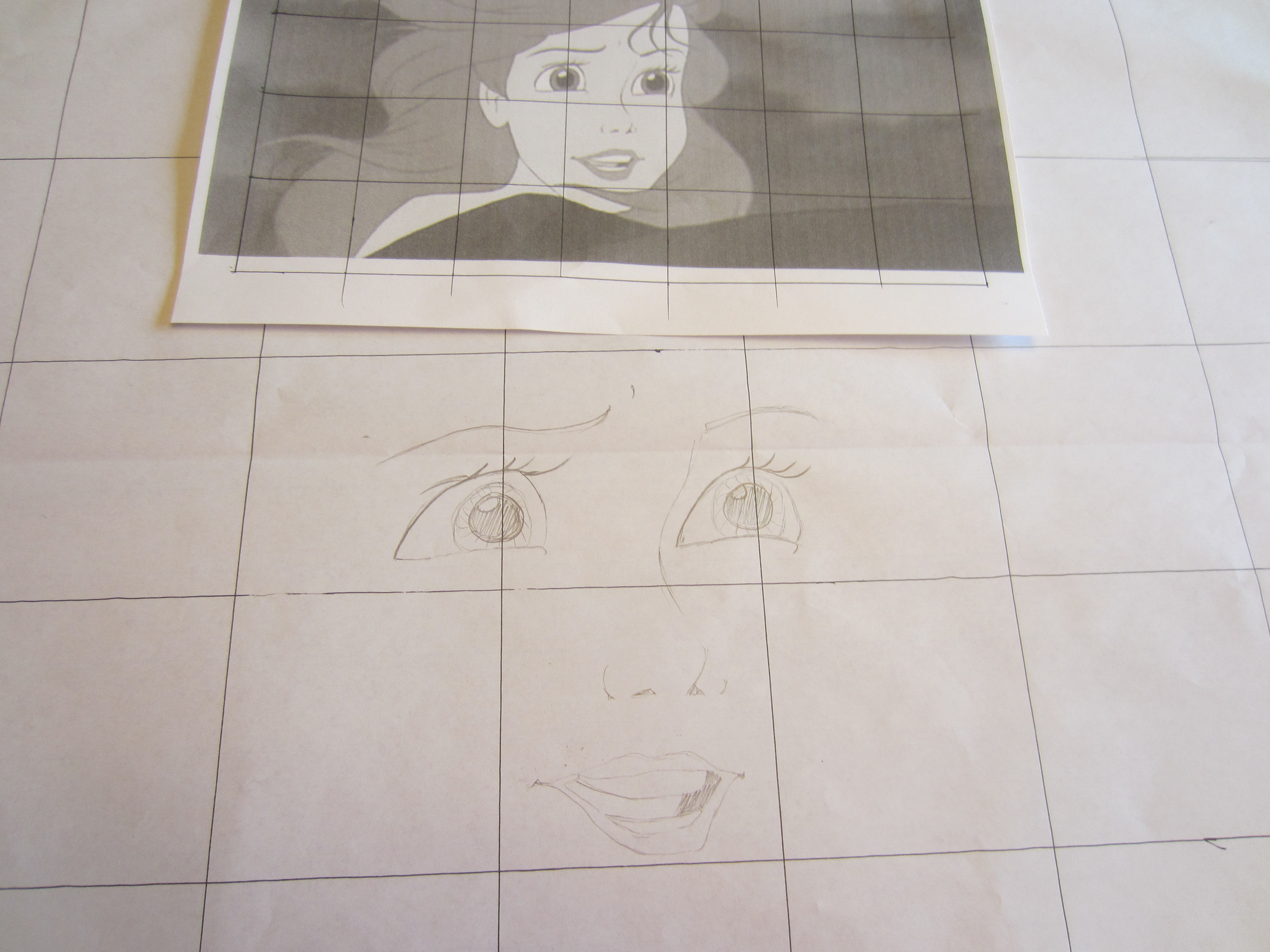 IMG_0734Next, I slowly began to draw the details of Miss Mermaid onto my large graph, making sure to keep things looking similar. I started with the face details, because those are the most important thing to get right when you are wanting your end product to resemble a certain character, rather than a cheap Dollar Store knock-off. You know what I mean- dolls like those ‘Disneee Princess Girlies’ you can buy for a dollar that are even LESS anatomically correct than their $20 role models.