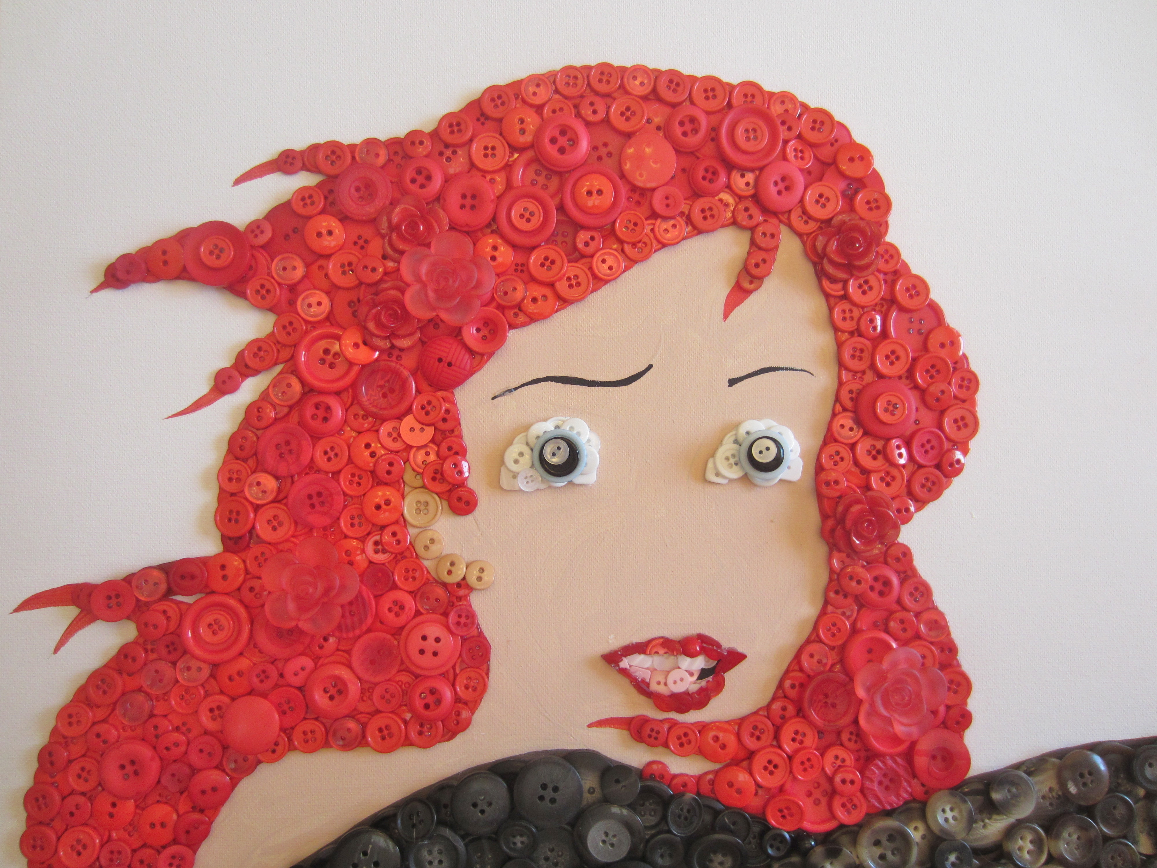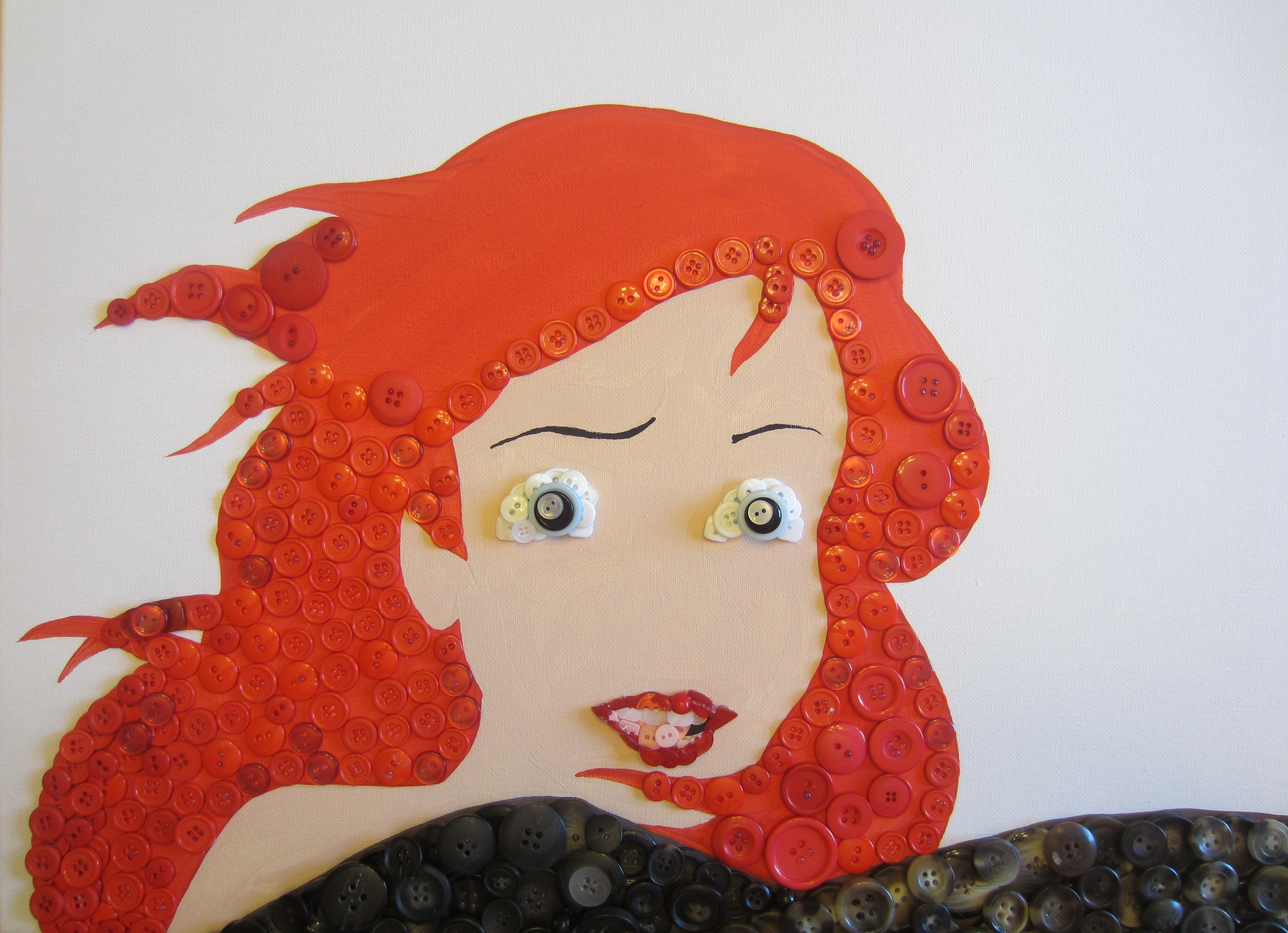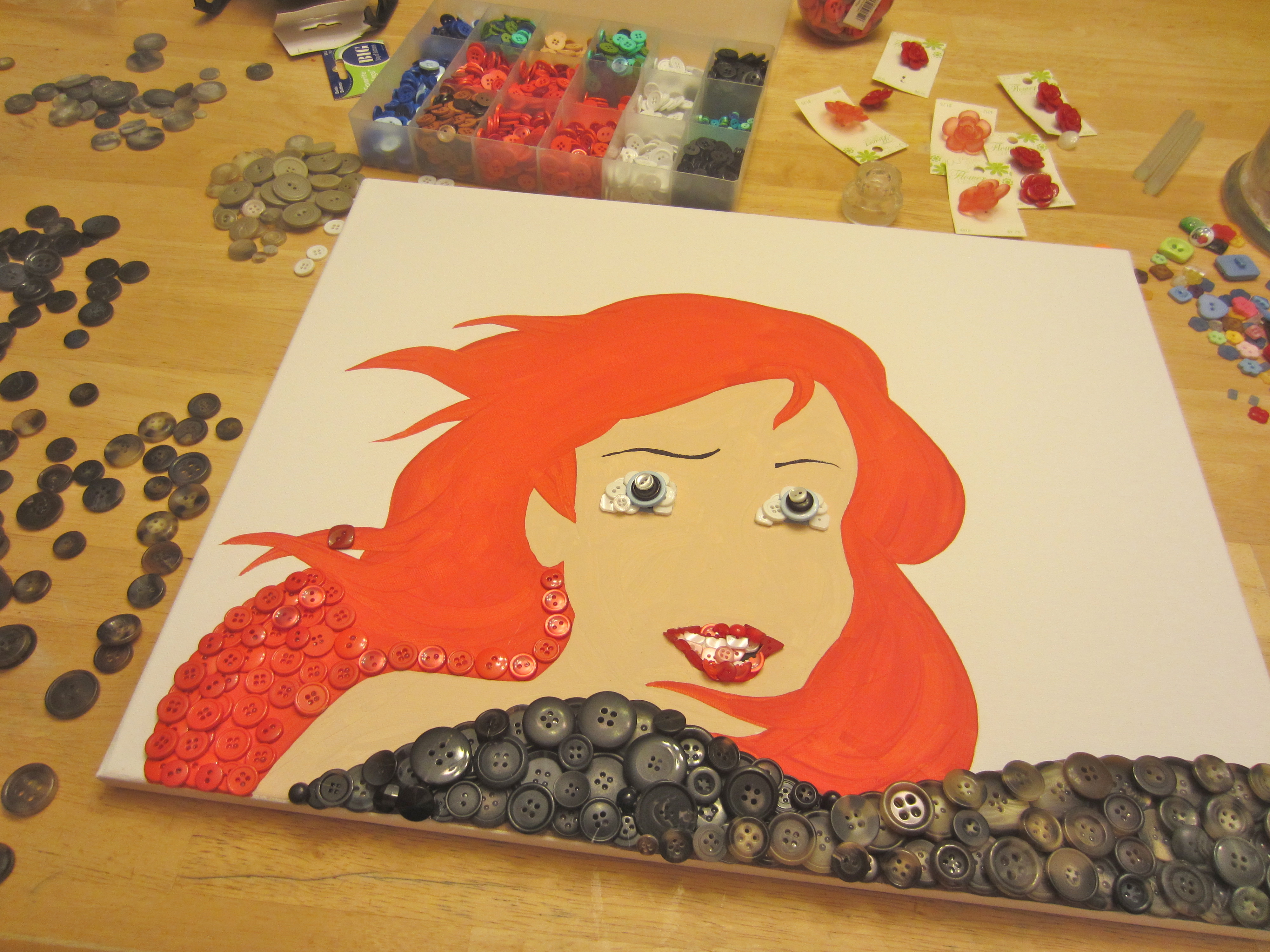 IMG_1077 Some random fish-chick… who was composed entirely out of BUTTONS! CRAZY HUH?!?!!?!  I was so excited when Christie from buttonlovers.com contacted me and asked if I’d be able to create something like this. Naturally, I said ‘heck yes’ even though I didn’t know if I could. Turns out I could.  And if you follow these simple 63 steps, you can to!! Hahaa there aren’t quite 63 steps, but this is definitely a time-consuming project, and if you haven’t made a button picture yet, I’d recommend that you check out one of my more simple projects first, such as this cupcake tutorial.