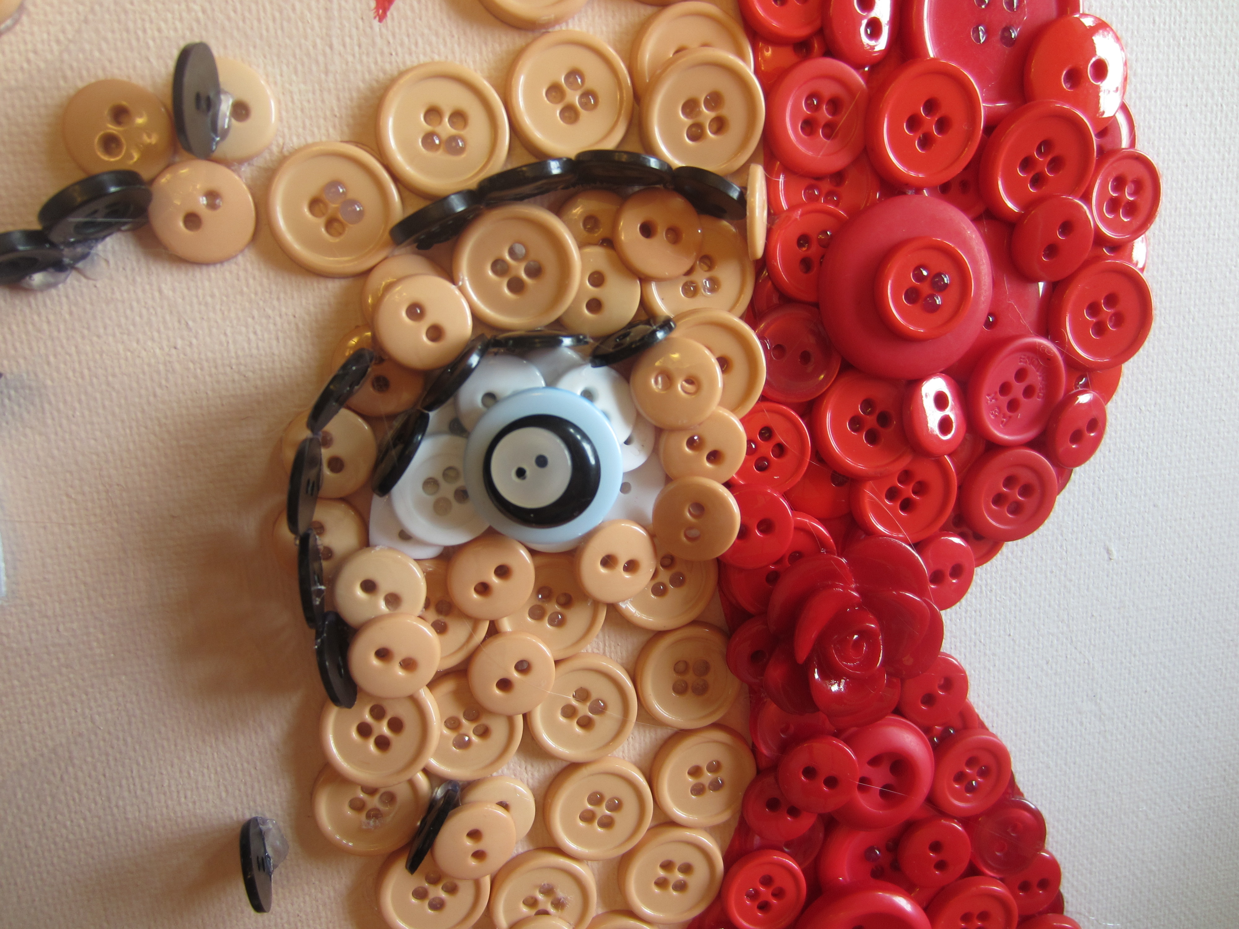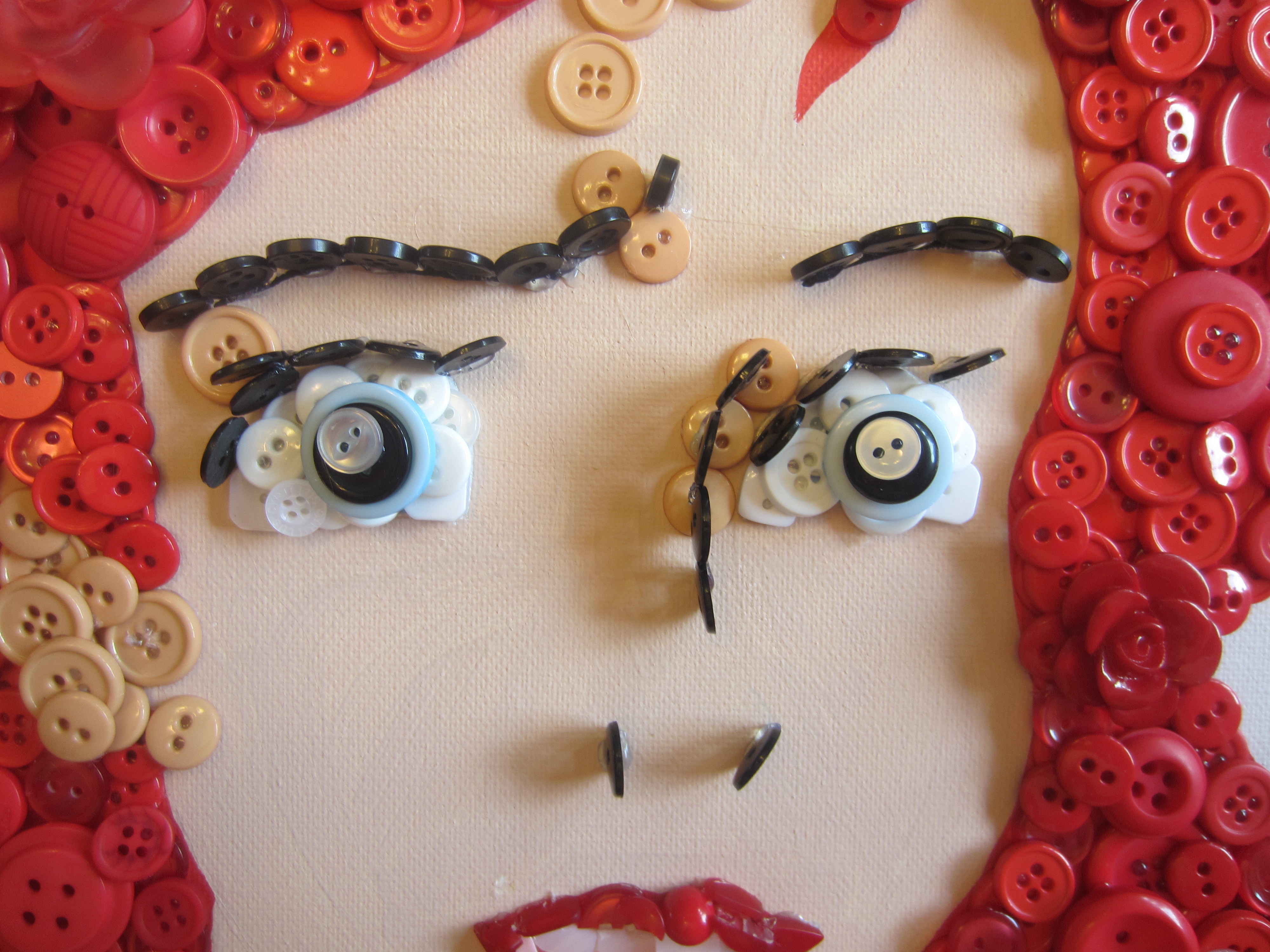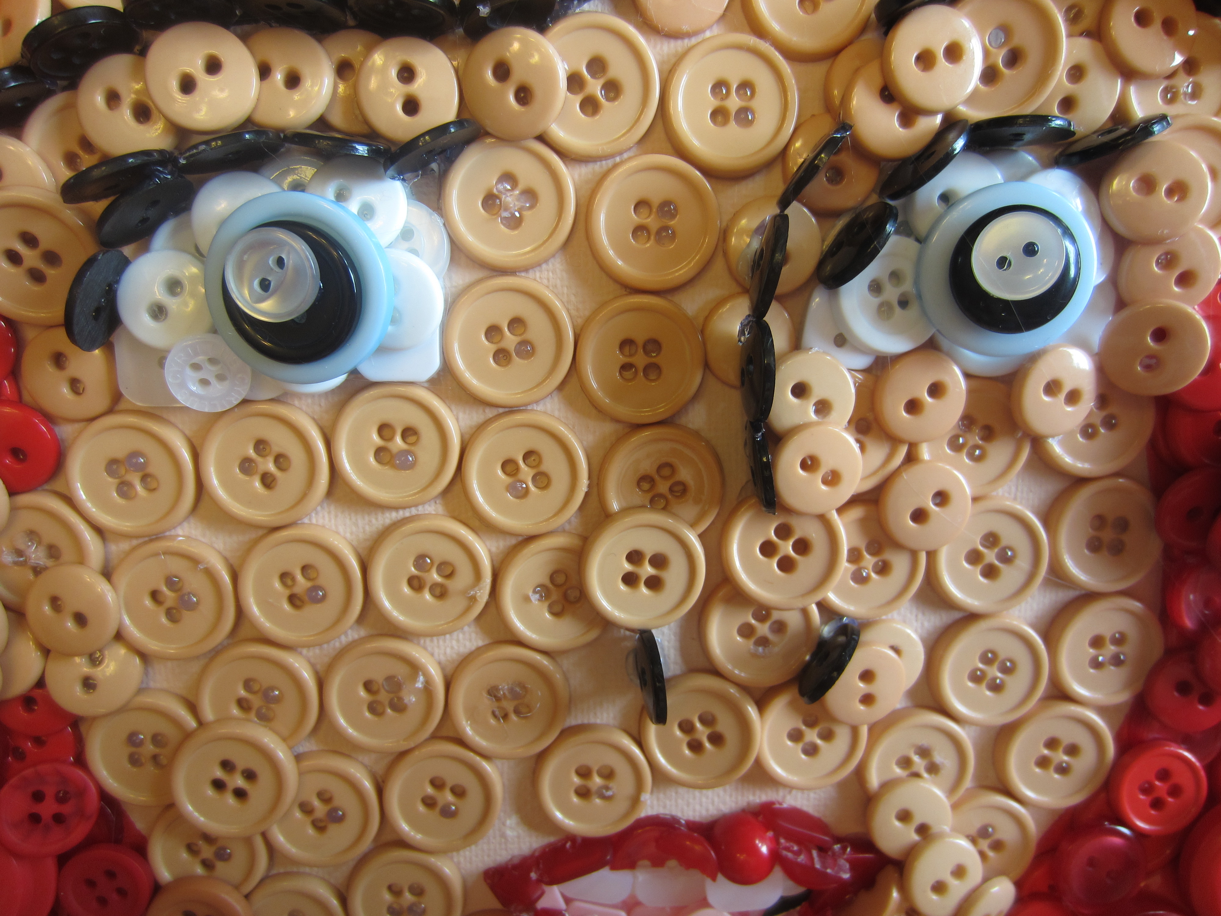 IMG_0841Since I was using a 16″x20″ canvas, some of the details of the mouth were pretty small, and even with my awesome button selection, I still needed to bust some buttons (hehe) to get it just right. I’ve been learning new tricks with each button picture I create!