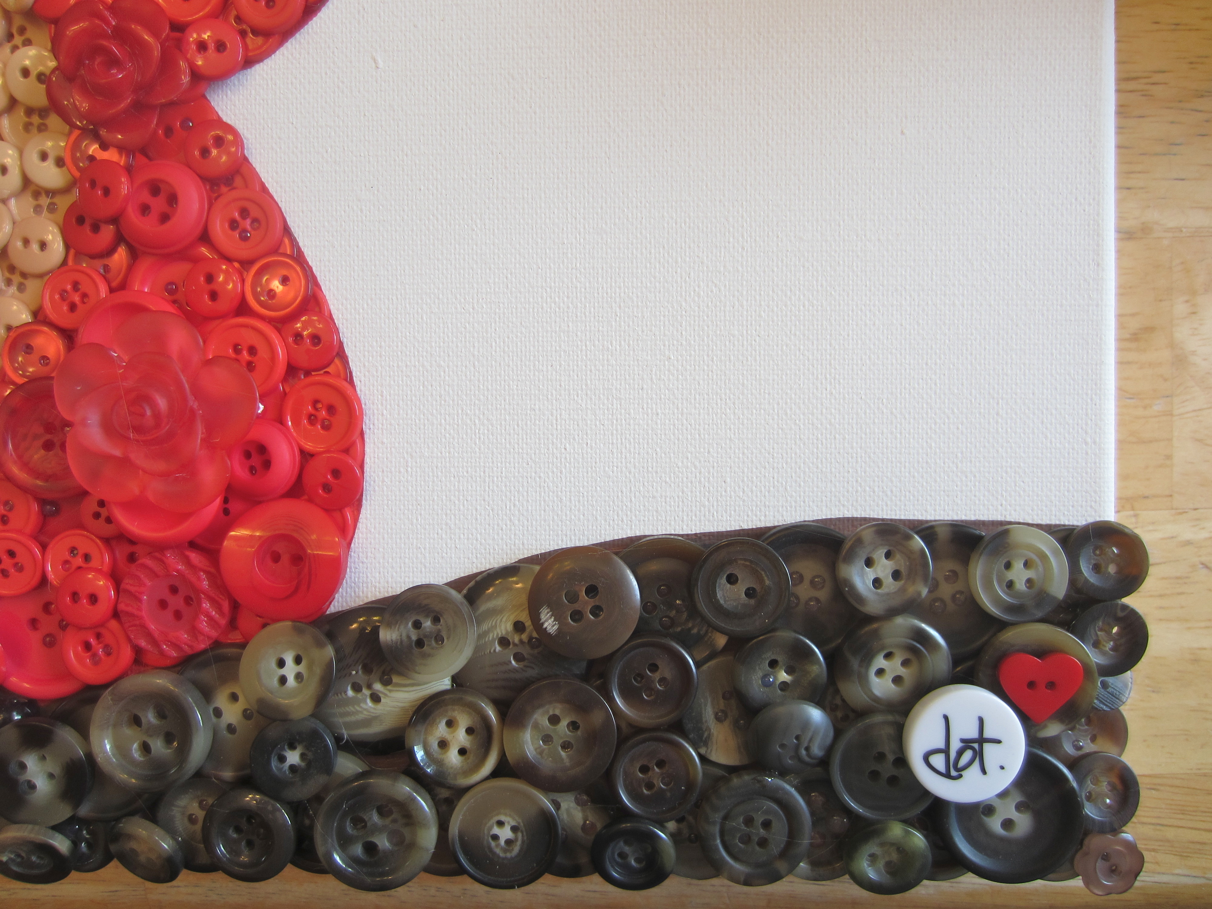 IMG_0873 For these skinny, and very important details, I actually turned buttons on their sides like this. Next time I do something like this I think I would cut the buttons in half, and glue the cut side onto the canvas. That way they would protrude less, but even so, it worked out just fine! See, I’m learning as I go too- I haven’t really found any super-detailed button tutorials around, so come along with me, dear buttoners, as we tread on new territory together! Let’s hug. Not that long. Ew, stop.