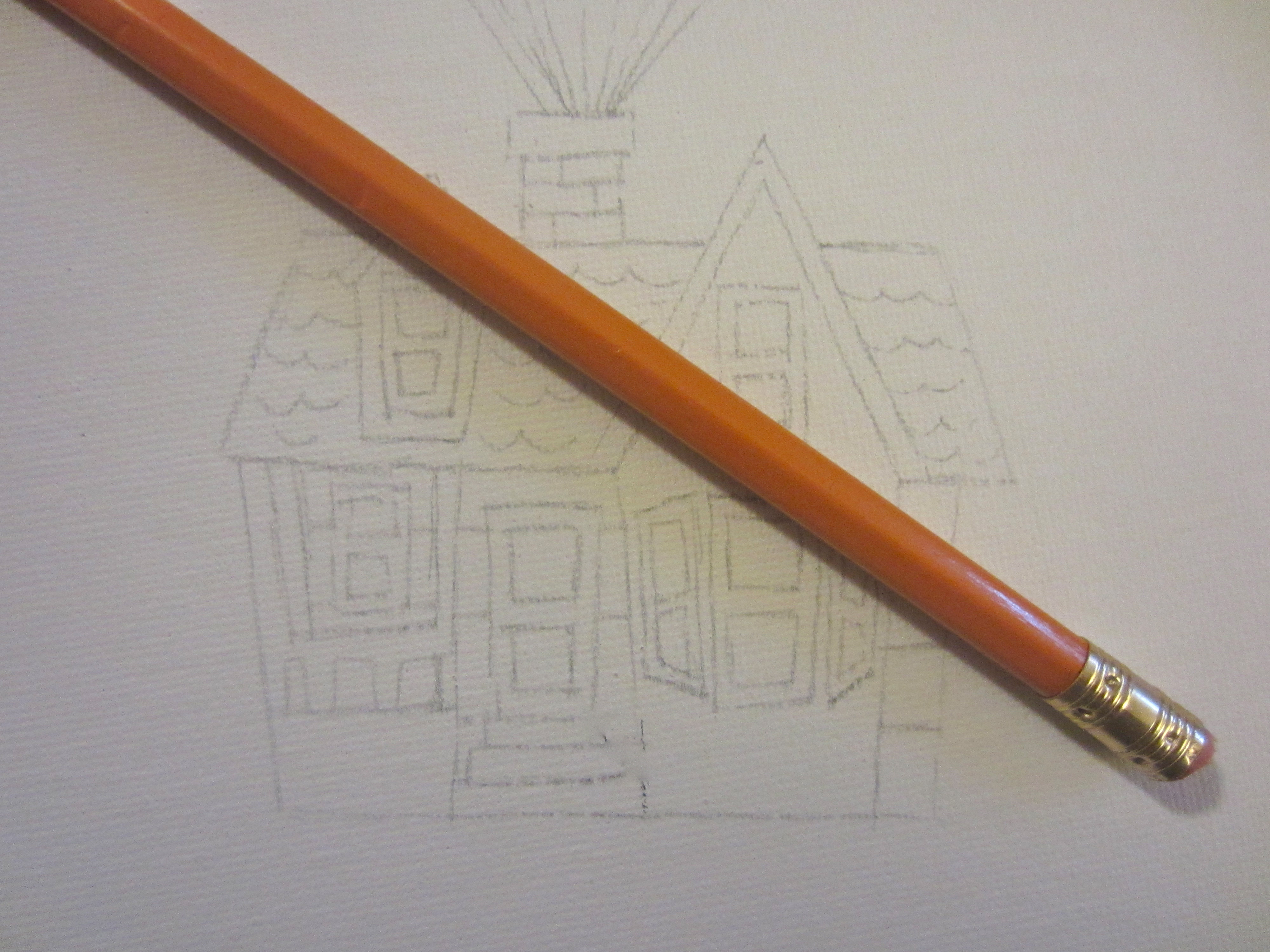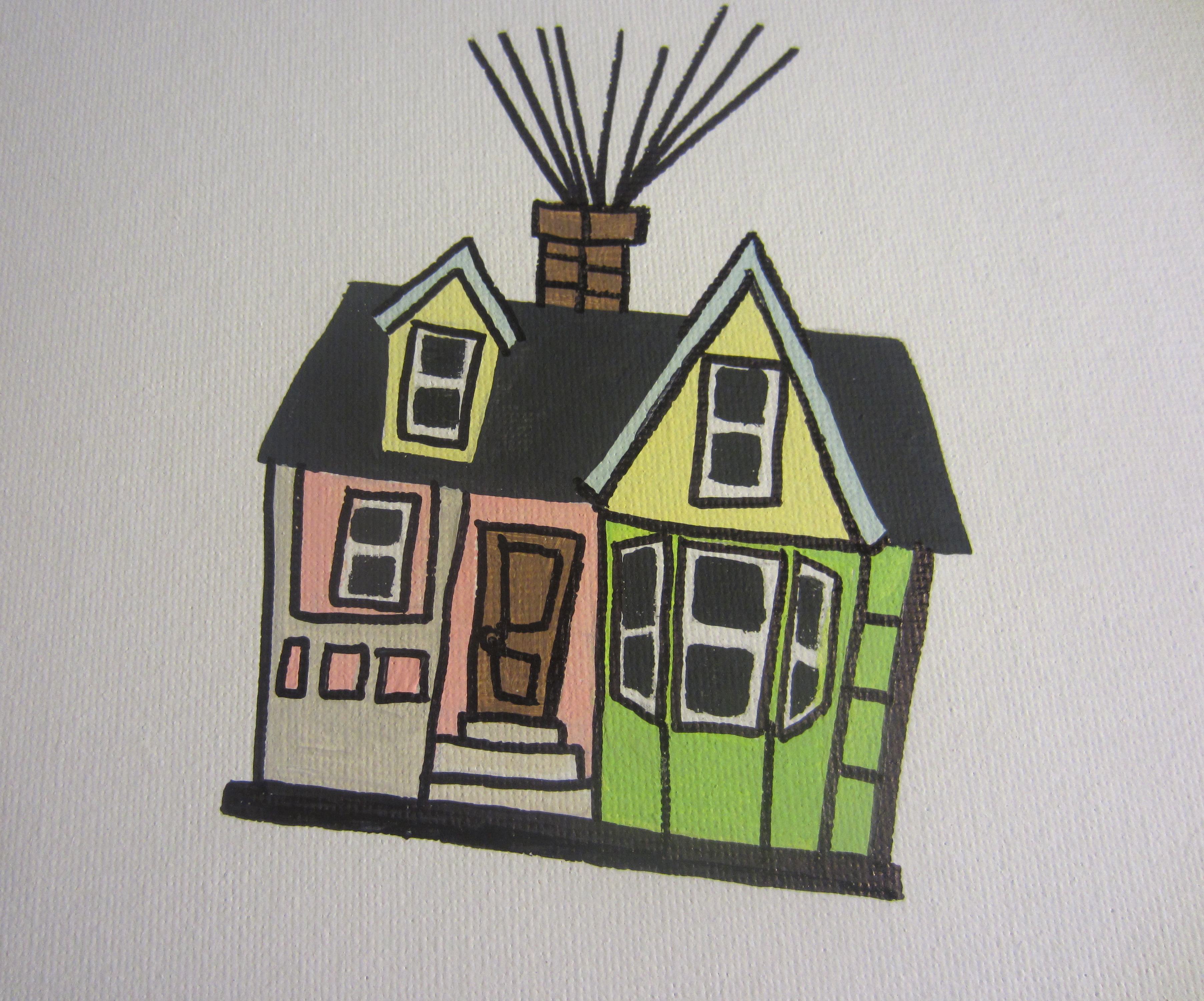 Firstly, I sketched out a version of the Up house. I did this on an 8×10 canvas board, which you can get at any craft store.