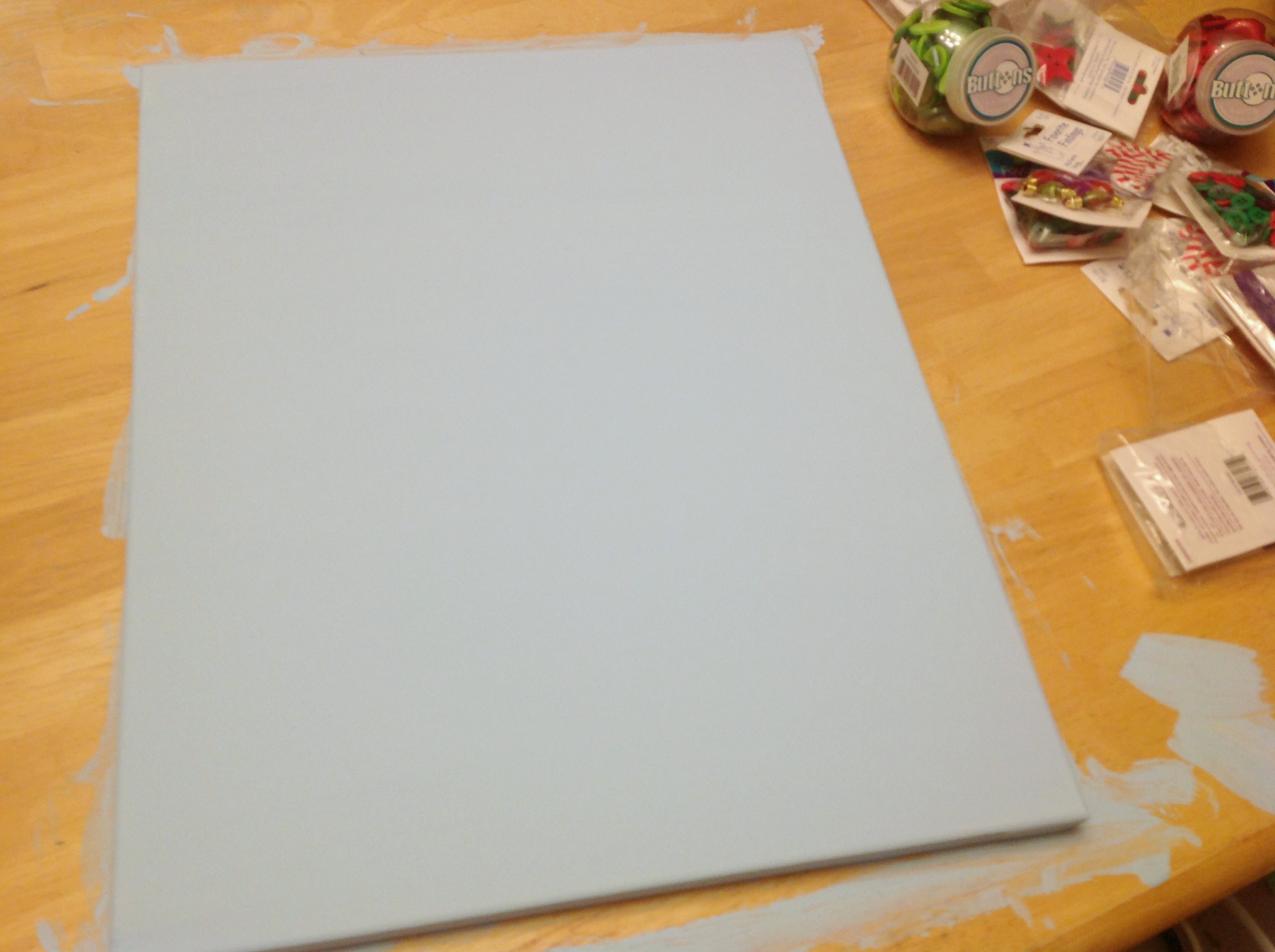 First I painted my background, because I wanted to have some snowflakes in the background, but I would have left it white otherwise! I just used one coat of cheap old acrylic craft paints!