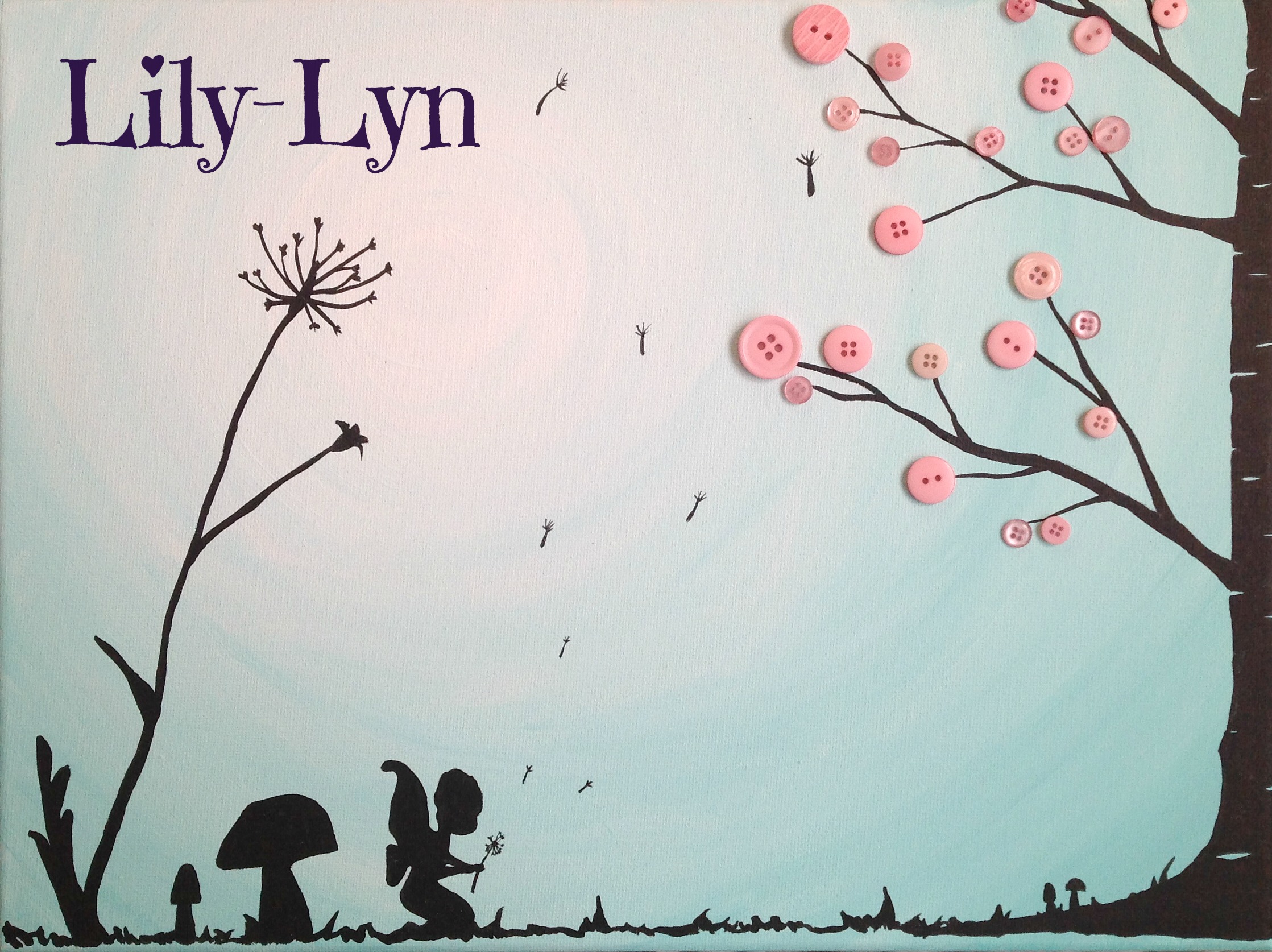I have been inspired by my daughter’s obsession with flower fairies lately so I painted this nifty fairy garden scene and slapped a birch button tree right on there: