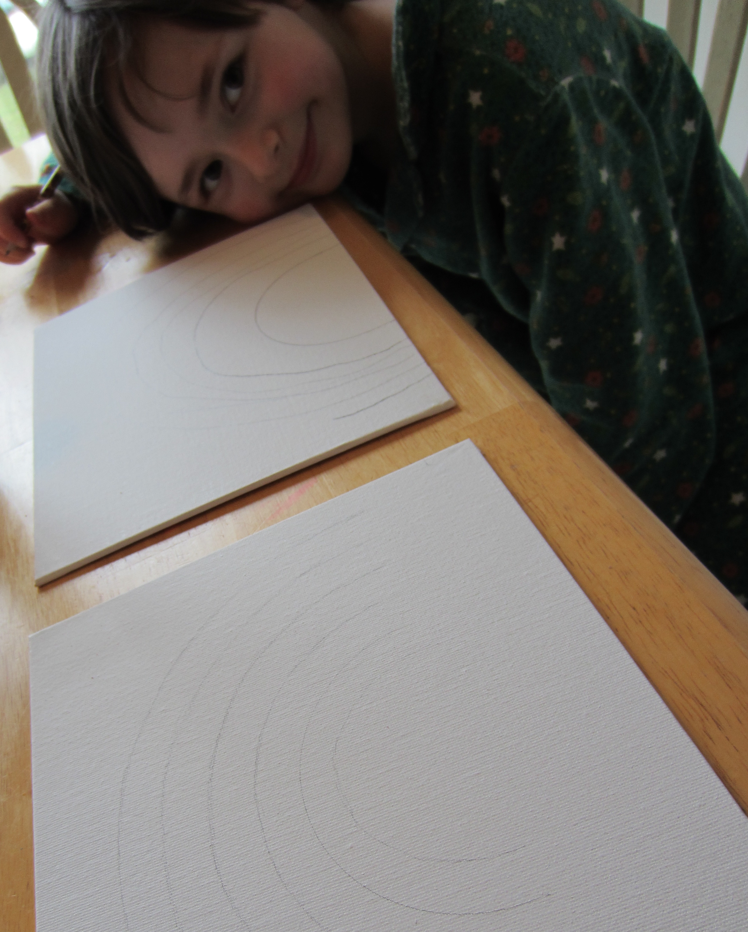 Step 1: Put on your Christmas PJ’s and draw the outline of a rainbow. I traced a bunch of different sized lids to make it perfect. Kid #1 just wung it. (Or would that be “winged it” or “wang it”?)