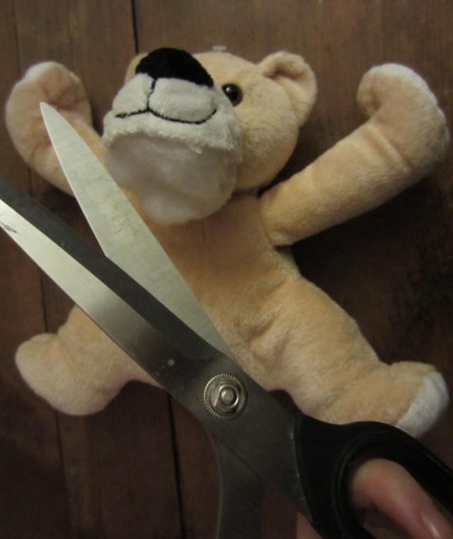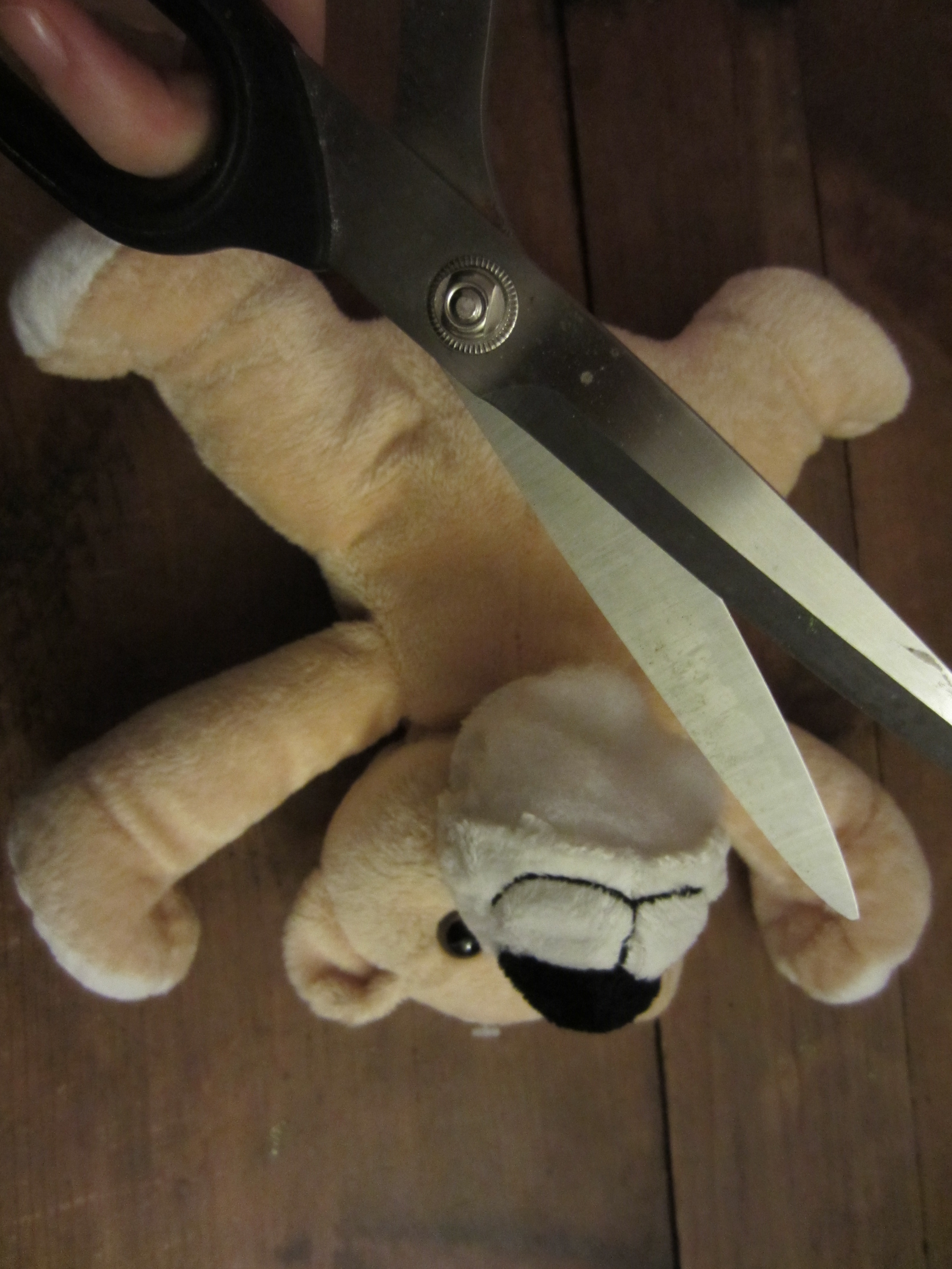 First cut open his face below his original mouth along the bottom seam. (Iām writing this in tutorial form- AS THOUGH ANYONE ELSE ON THE PLANET IS EVER GOING TO DO THIS.)